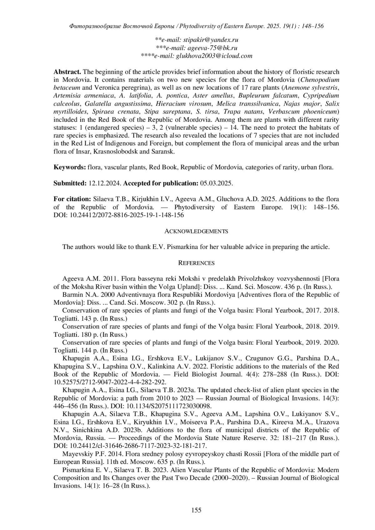 25. [Silaeva et al.] Силаева, Т. Б., Лукиянов, С. В., Моисеева, П. А., Уразова, Н. В., Синичкина, А. Д., Есина, И. Г., Федашева, Е. С., Аникина, Е. П., Бойнова, Я. Ю., Ведякова, Д. П., Письмаркина, Е. В., Учеваткина, Ю. П., Агеева, А. М., Хапугин, А. А. 2022. Дополнения к чужеземной флоре Республики Мордовия (Европейская Россия). - Полевой журнал биолога. 4(2): 95-118. DOI: 10.52575/2712-9047-2022-4-2-95-118 EDN: XJLFKK
