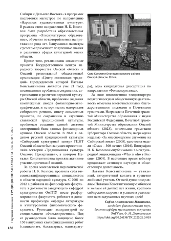 Имя Натальи Константиновны Козловой хорошо известно в научных фольклористических кругах. Сибирский фольклорист, доктор филологических наук, профессор кафедры литературы и культурологии Омского государственного педагогического университета, доцент, председатель Омской областной общественной организации «Центр славянских традиций», член Консультативного совета по национальным и межконфессиональным отношениям при Губернаторе Омской области; член Экспертного совета по делам национальностей и религий при Администрации г. Омска; заместитель председателя областной комиссии по нематериальному этнокультурному достоянию при Министерстве культуры Омской области; член Художественноэкспертного совета по народным художественным промыслам — список регалий можно продолжать еще долго.