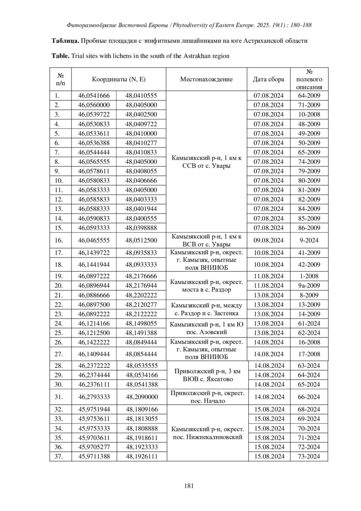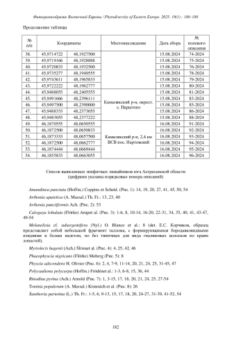 В августе 2024 года нами исследовалась флора и растительность дельты р. Волги (юг Астраханской области: Камызякский и Приволжский районы). В результате были выполнены 272 геоботанических описания растительности, из них на 54 пробных площадках (таблица) в кустарниковых пустынных сообществах встречены эпифитные лишайники, приуроченные к стволам и ветвям Elaeagnus angustifolia L. (№№ 2, 8-10, 12, 13, 15, 17, 18, 21, 24, 25, 27, 31-44, 46-48), Tamarix ramosissima Ledeb. (№№ 1, 3-7, 11-14, 16, 19, 20, 22, 23, 28-30, 34, 37, 43-46, 48- 54) и Ulmus pumila L. (№ 26). Коллекторы: В. М. Васюков, А. В. Чувашов, Н. Ю. Степанова, М. В. Мальцев.