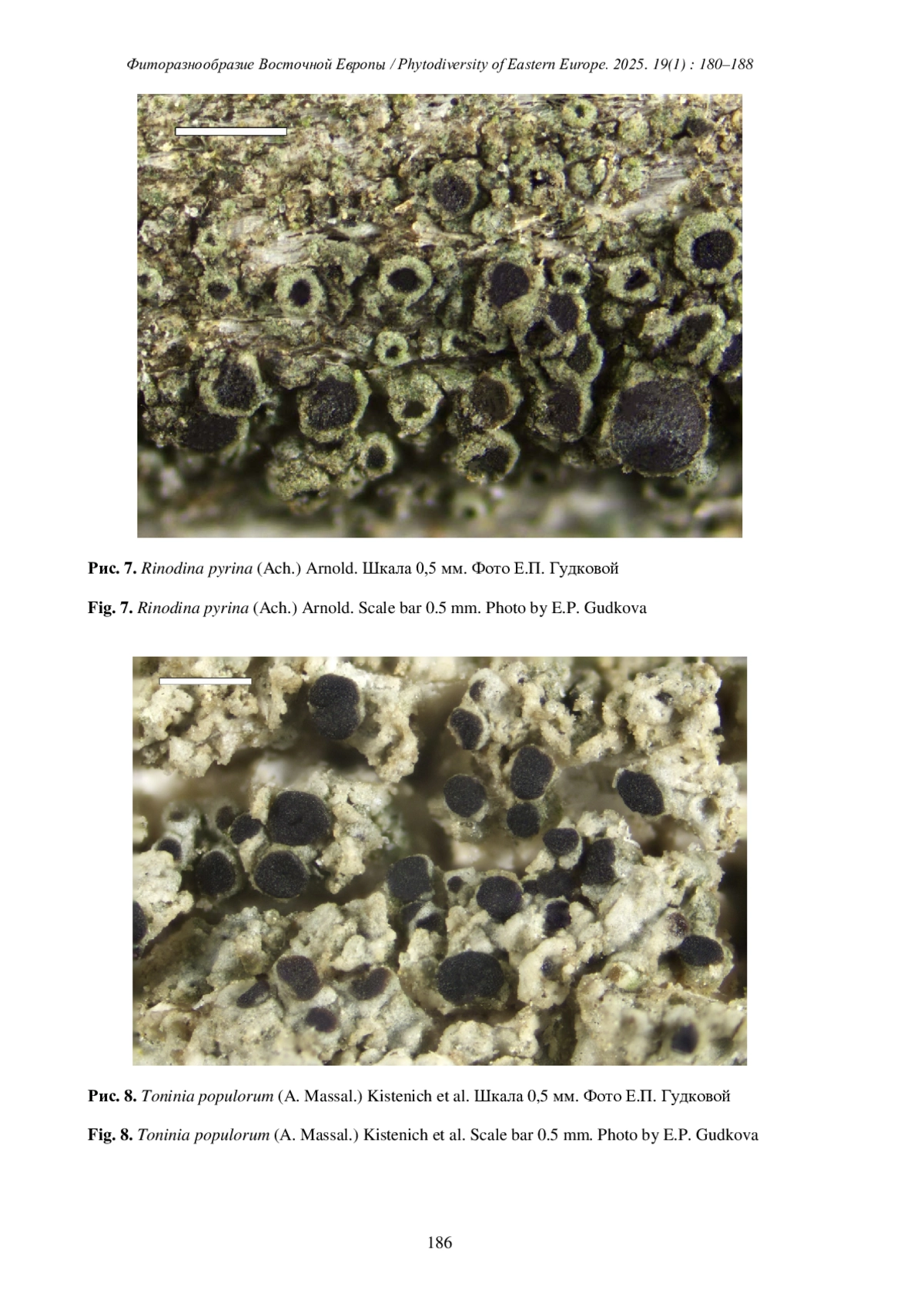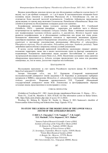 На 54 геоботанических описаниях пробных площадок пустынной зоны Нижней Волги (в пределах южной части Астраханской области) выявлено 12 видов эпифитных лишайников: Amandinea punctata (Hoffm.) Coppins et Scheid., Arthonia apatetica (A. Massal.) Th. Fr., Arthonia punctiformis Ach., Calogaya lobulata (Flörke) Arupet al., Melanelixia cf. subargentifera (Nyl.) O. Blanco et al., Myriolecis hagenii (Ach.) Śliwa et al., Phaeophyscia nigricans (Flörke) Moberg, Physcia adscendens H. Olivier, Polycauliona polycarpa (Hoffm.) Frödénet al., Rinodina pyrina (Ach.) Arnold, Toninia populorum (A. Massal.) Kistenichet al., Xanthoria parietina (L.) Th. Fr.