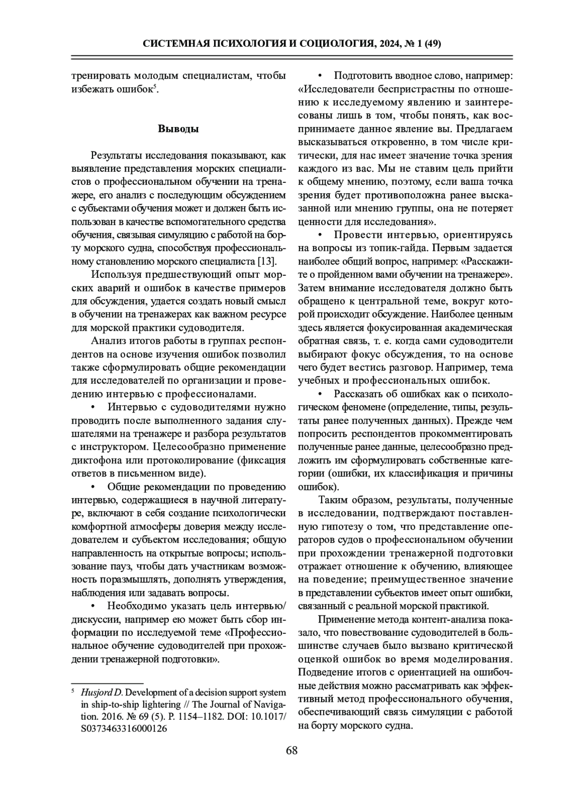 При все более совершенных автоматизированных системах управления сохраняющаяся высокая аварийность на морском транспорте определяет необходимость поиска решений, обеспечивающих безопасность человека, груза и судна. При ведущей роли оператора в системе «человек - техника - среда» изучение представления судоводителей о профессиональном обучении на моделированных комплексах (тренажерах) имеет потенциал черного ящика, так как способно обнаружить имплицитные составляющие - смыслы, мотивы и ценности, - в значительной степени определяющие поведение субъекта в процессе обучения. В исследовании с участием двух групп специалистов - судоводителей, граждан России и граждан КНР, проходящих обучение на тренажере радиолокационной подготовки и морской электронной картографии, был применен метод интервью с последующей обработкой данных с помощью контент-анализа. Выделены пять компонентов (когнитивный, исполнительный, эмоциональный, ценностно-мотивационный, профессиональный), объединяющих различные единицы анализа текстов, на основе которых дана интерпретация представления субъектов об учебной деятельности и ее психологическом содержании. Результаты исследования обнаруживают различия в представлениях двух групп респондентов, которые характеризуют учебную деятельность на тренажере как развивающую (группа китайских судоводителей), стабилизирующую, или стагнирующую (группа российских судоводителей). На основе данных структурированных интервью сформулированы рекомендации по содержанию работы с группой специалистов-судоводителей при подведении итогов обучения. Акцент ставится на обсуждении выбранной самими судоводителями главной темы - ошибки оператора судна. Опыт ошибки имеет ведущее значение в представлении совокупного субъекта и выступает связующим звеном между профессиональным обучением и морской практикой.