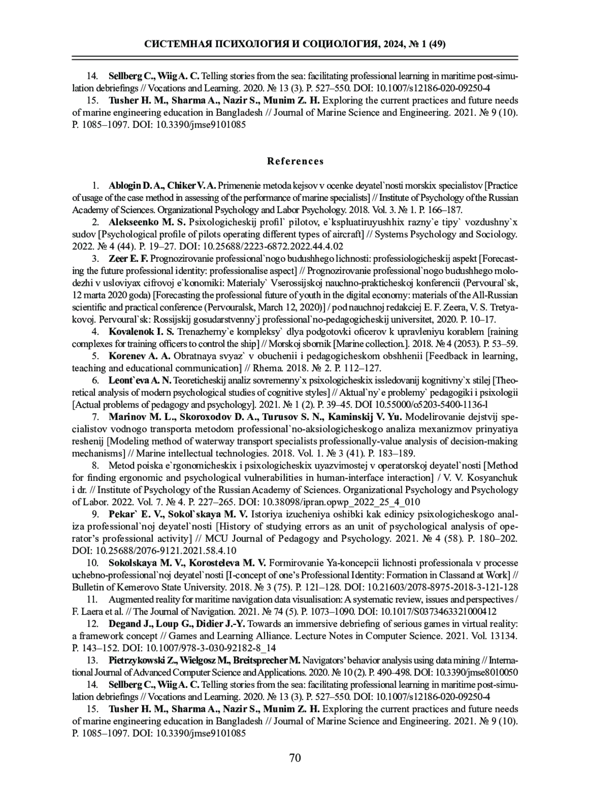 14. Sellberg C., Wiig A. C. Telling stories from the sea: facilitating professional learning in maritime post-simulation debriefings // Vocations and Learning. 2020. № 13 (3). P. 527-550. DOI: 10.1007/s12186-020-09250-4 EDN: XWGLTK