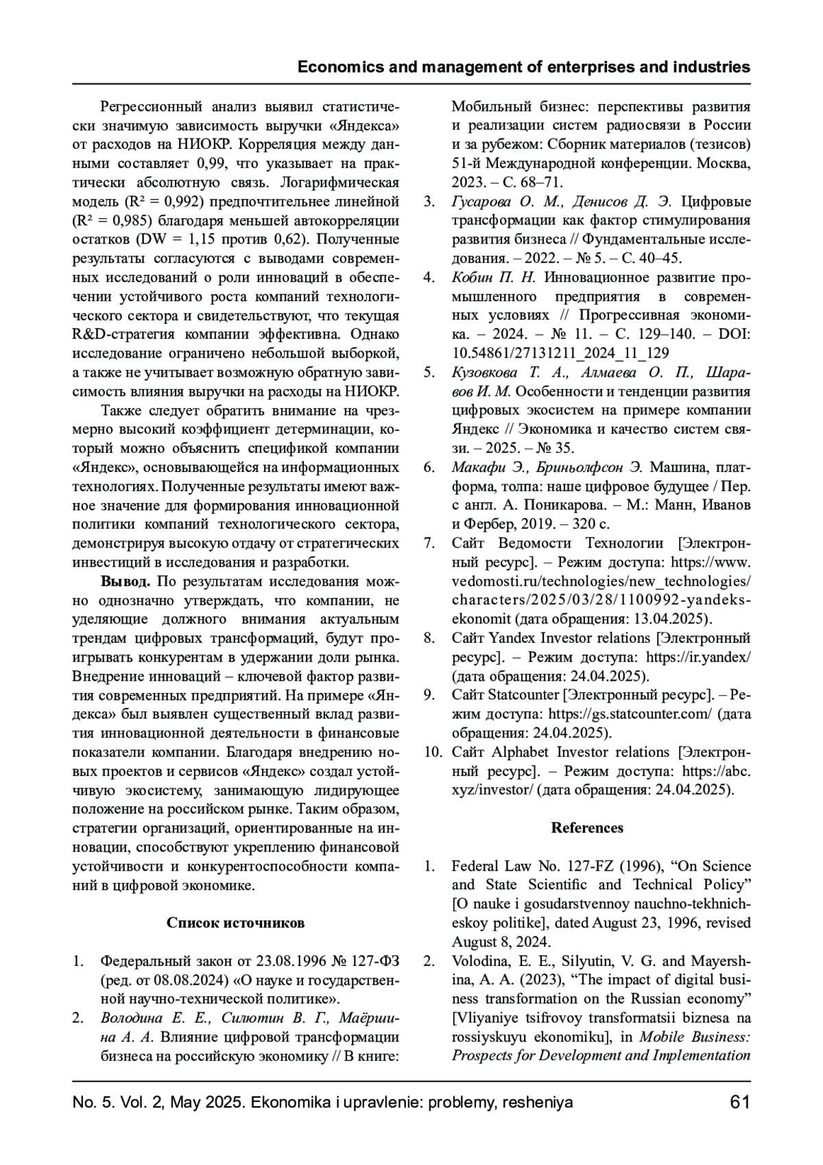 5. Кузовкова Т. А., Алмаева О. П., Шаравов И. М. Особенности и тенденции развития цифровых экосистем на примере компании Яндекс // Экономика и качество систем связи. - 2025. - № 35. EDN: THGALI