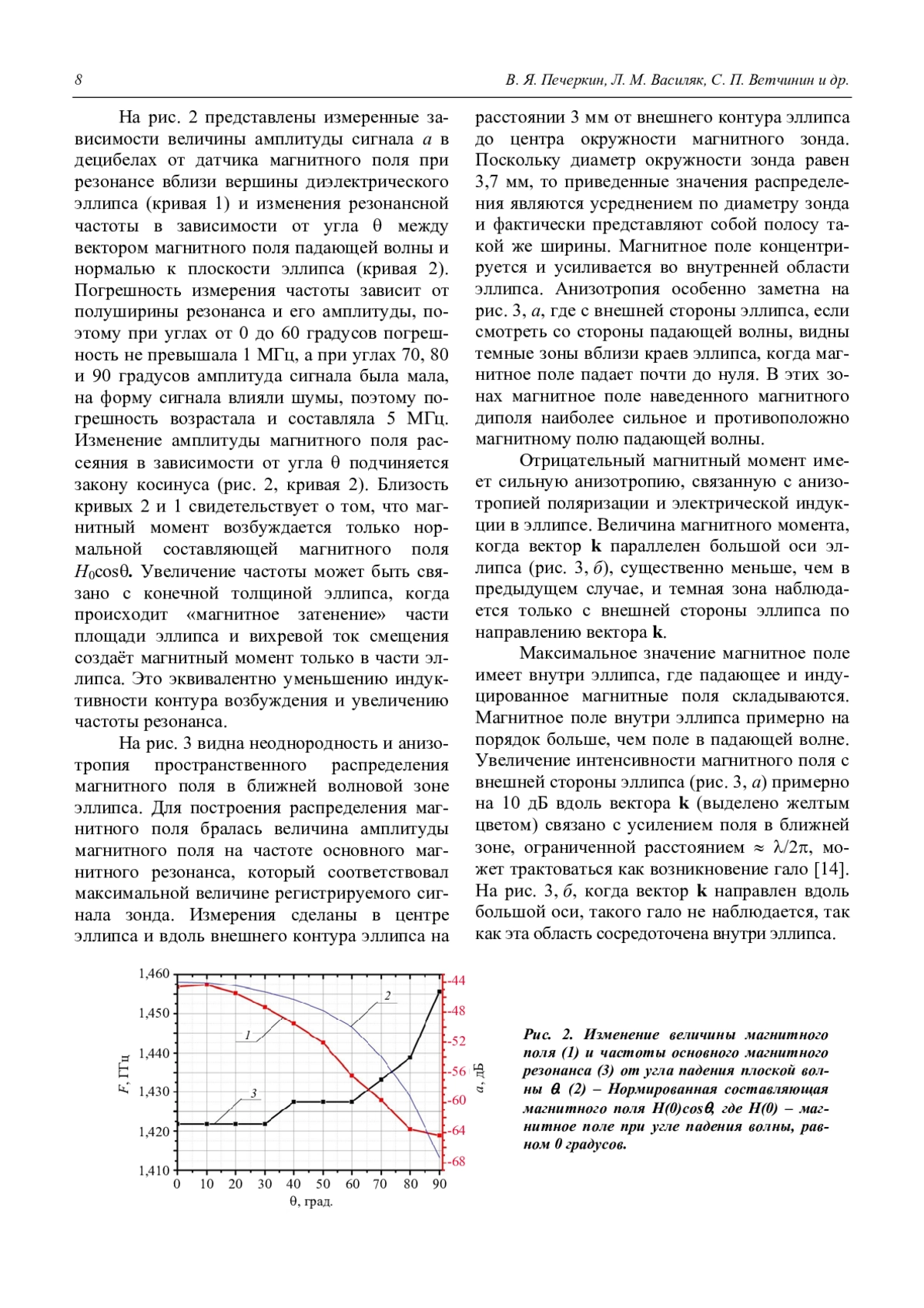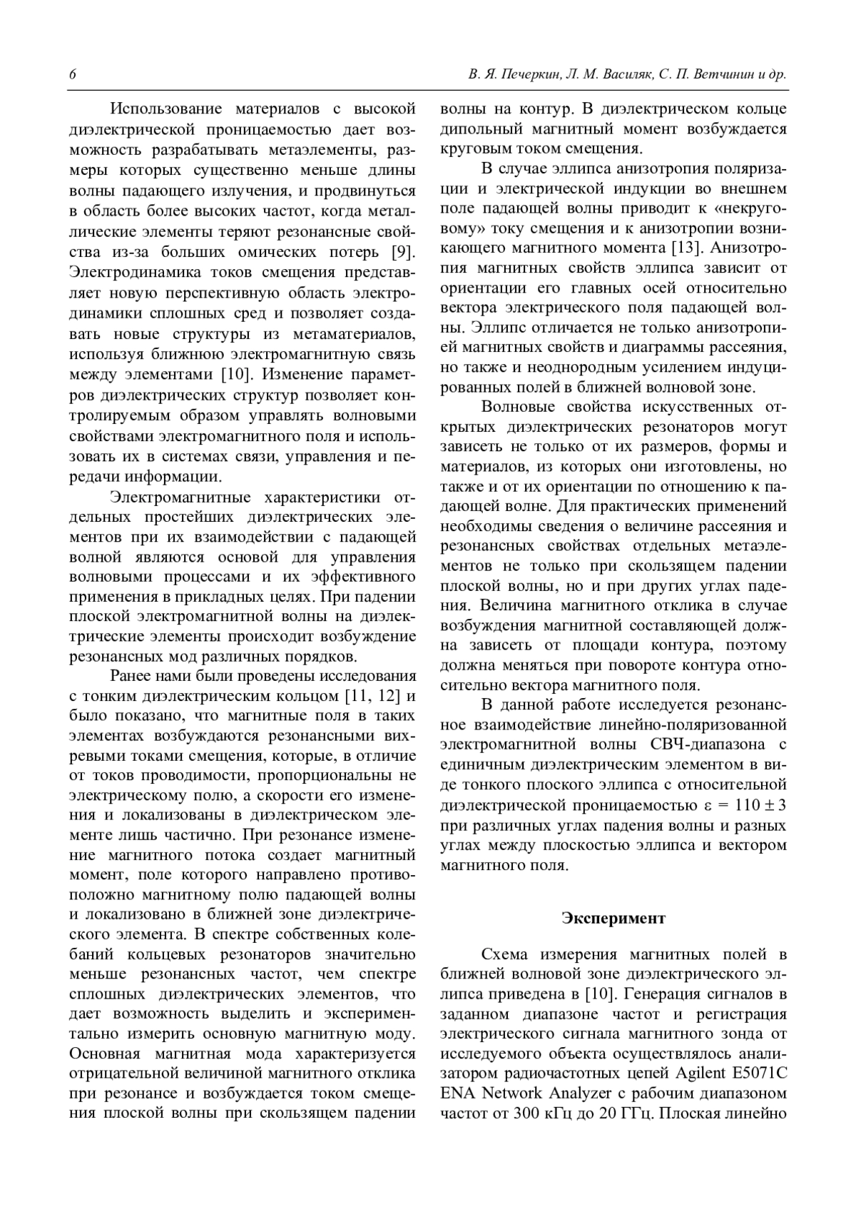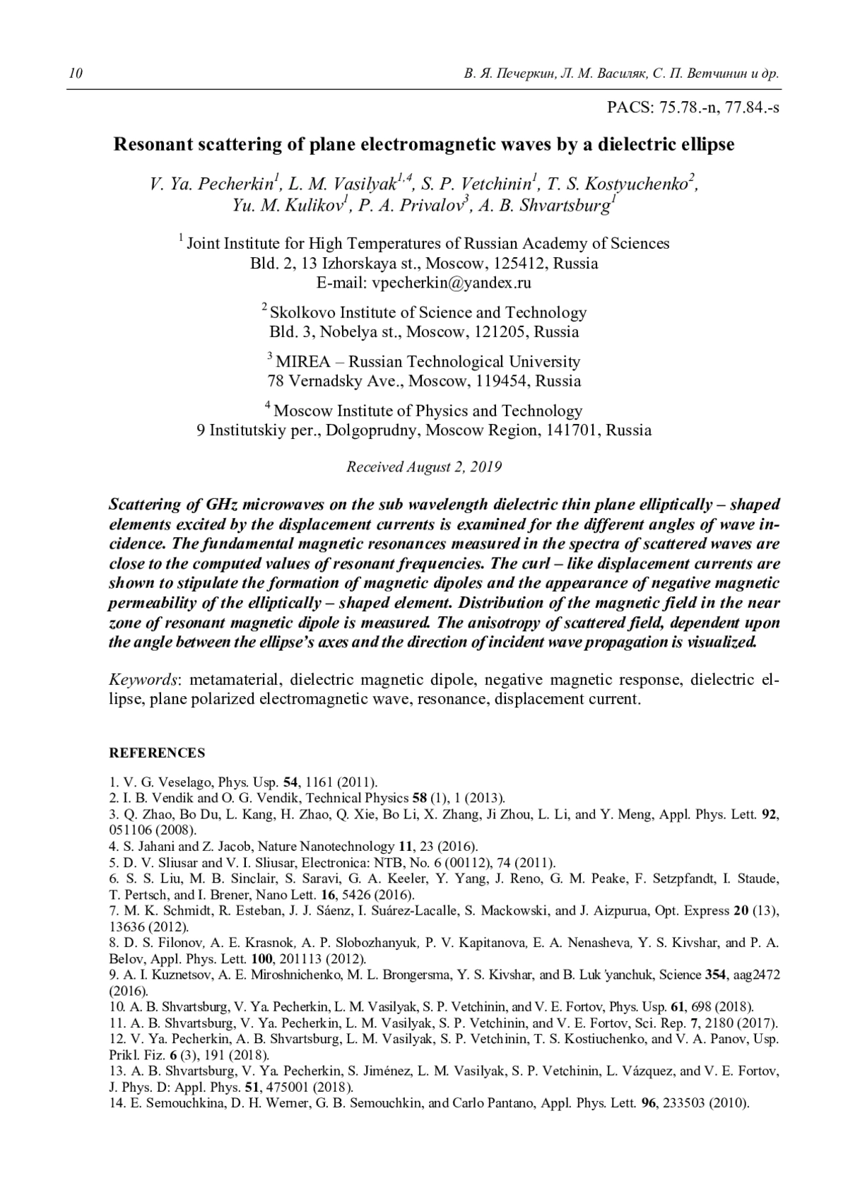 ПЕЧЕРКИН В., ВАСИЛЯК Л., ВЕТЧИНИН С. П., КОСТЮЧЕНКО Т. С., КУЛИКОВ Ю. М., ПРИВАЛОВ П. А., ШВАРЦБУРГ А. Б. РЕЗОНАНСНОЕ РАССЕЯНИЕ ПЛОСКИХ ЭЛЕКТРОМАГНИТНЫХ ВОЛН ДИЭЛЕКТРИЧЕСКИМ ЭЛЛИПСОМ // ПРИКЛАДНАЯ ФИЗИКА. 2019. №4