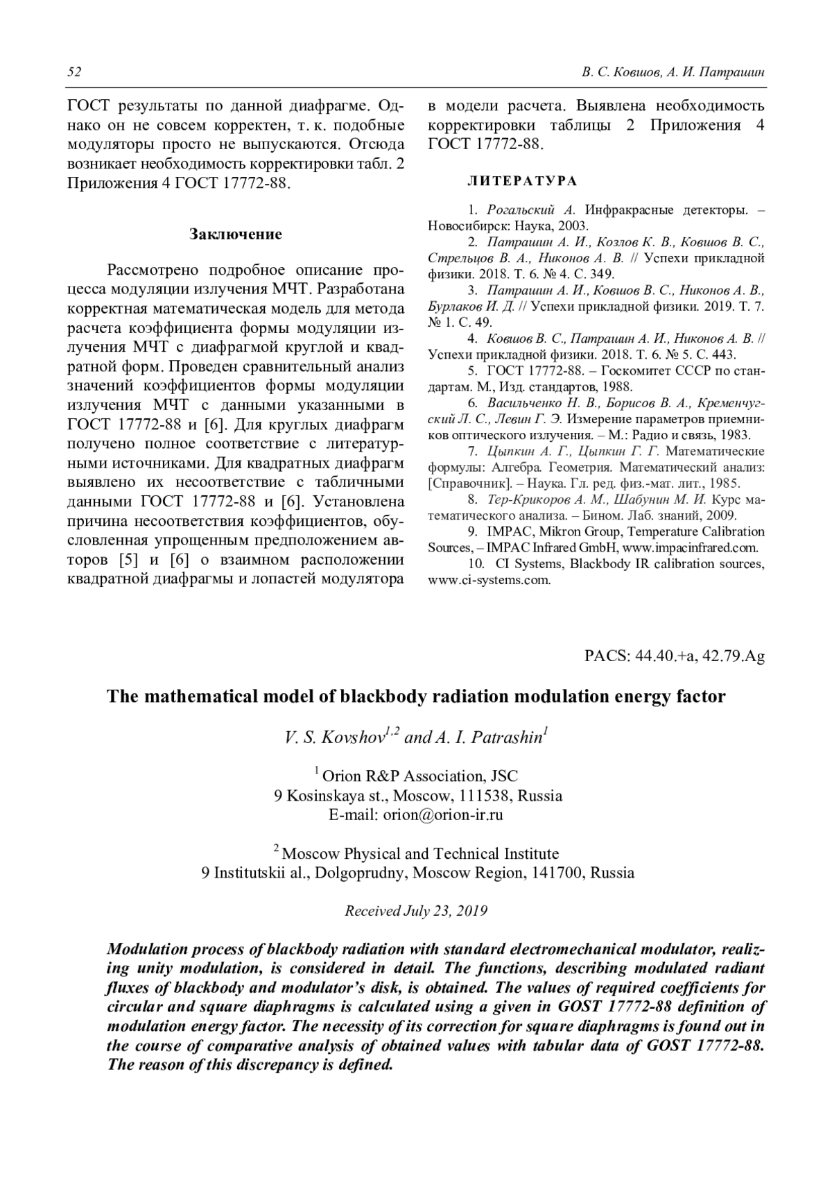 Статья: Математическая модель процесса модуляции излучения МЧТ (2019)