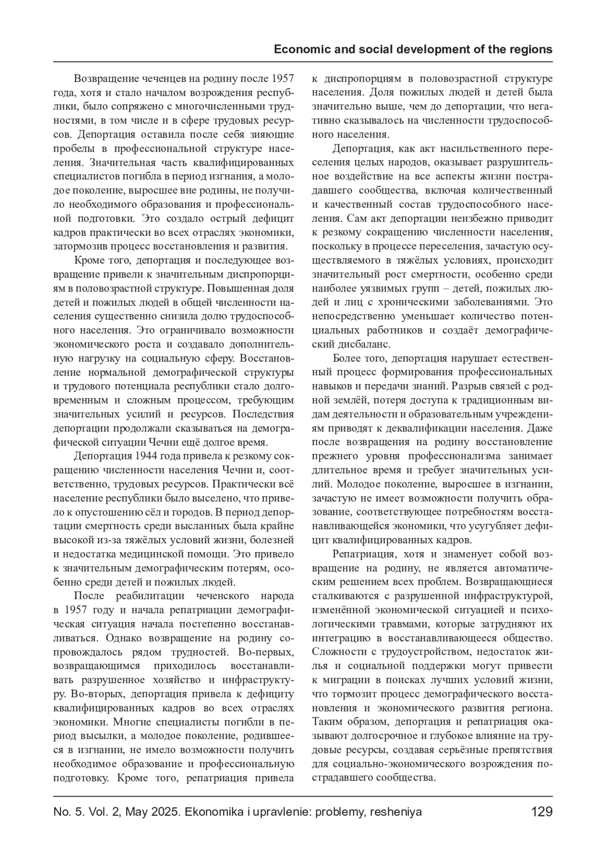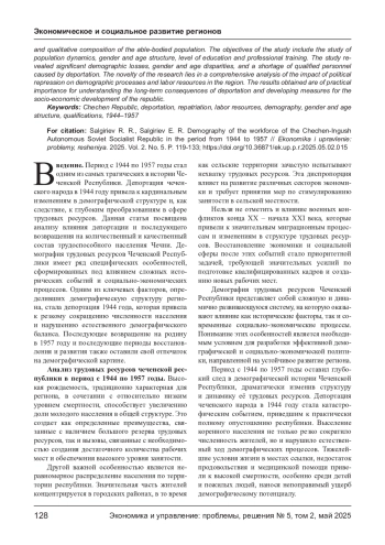 Данная статья исследует демографические изменения трудовых ресурсов Чеченской Республики в период с 1944 по 1957 годы, охватывающий депортацию чеченского народа и последующее возвращение. Целью исследования является анализ влияния депортации и репатриации на количественный и качественный состав трудоспособного населения. В задачи исследования входит изучение динамики численности населения, половозрастной структуры, уровня образования и профессиональной подготовки. В результате исследования выявлены значительные демографические потери, диспропорции в половозрастной структуре и дефицит квалифицированных кадров, обусловленные депортацией. Новизна исследования заключается в комплексном анализе влияния политических репрессий на демографические процессы и трудовые ресурсы региона. Полученные результаты имеют практическую значимость для понимания долгосрочных последствий депортации и разработки мер по социально-экономическому развитию республики.