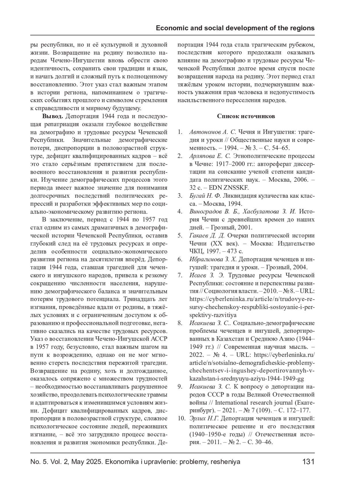 10. Эрлих Н.Г. Депортация чеченцев и ингушей: политическое решение и его последствия (1940-1950-е годы) // Отечественная история. - 2011. - № 2. - С. 30-46.