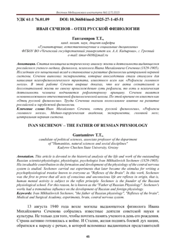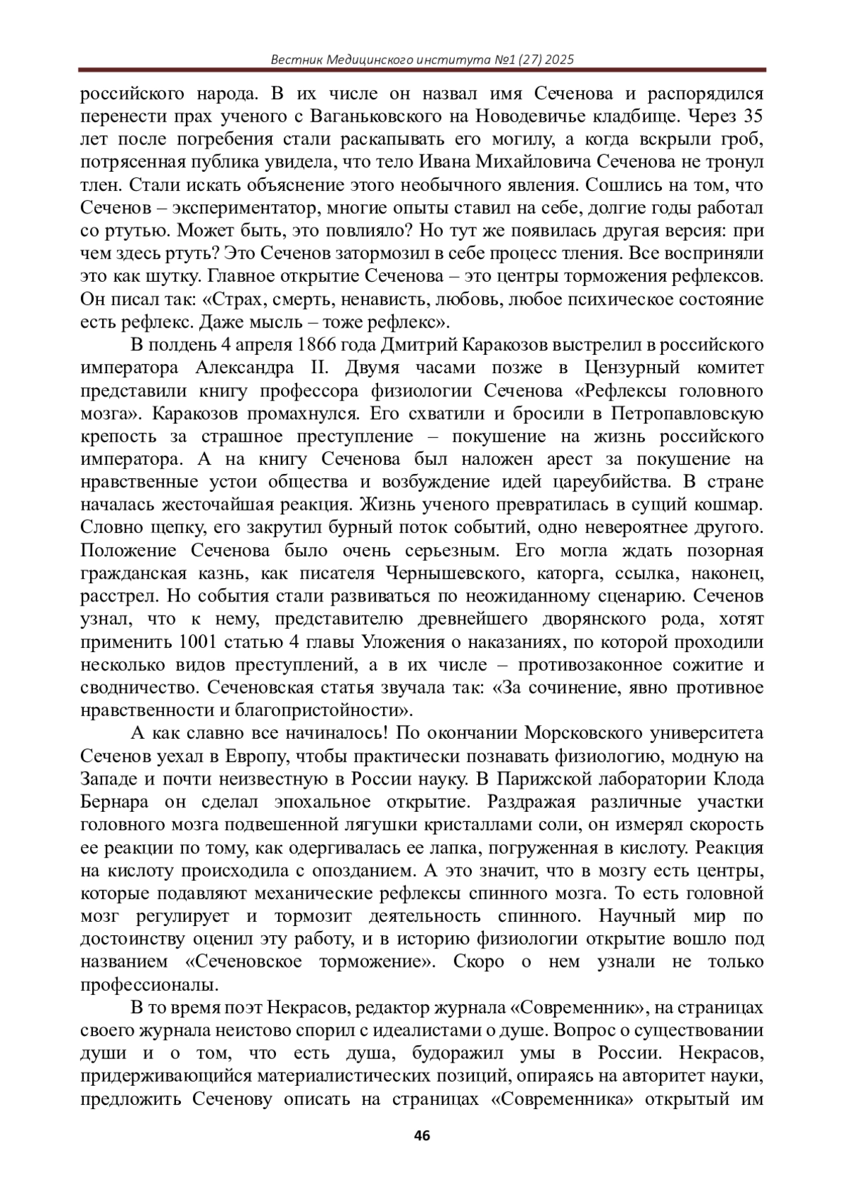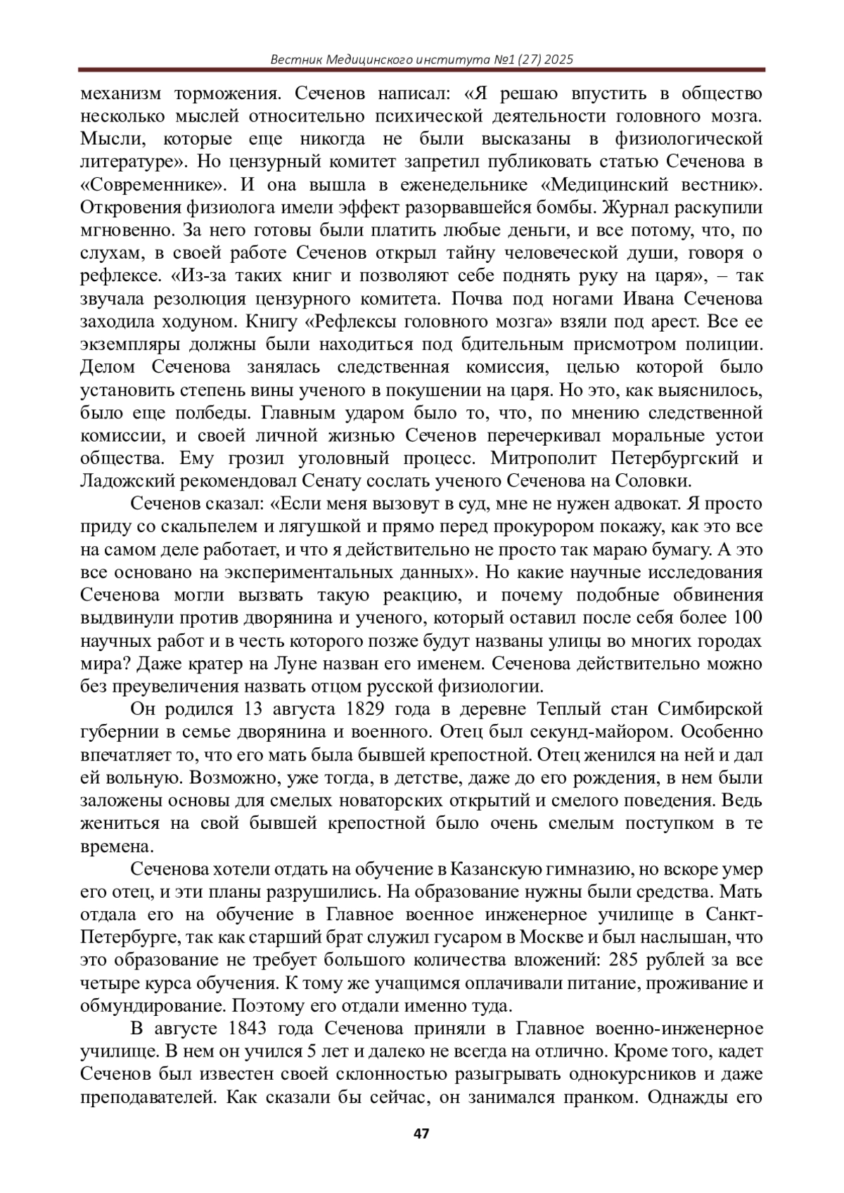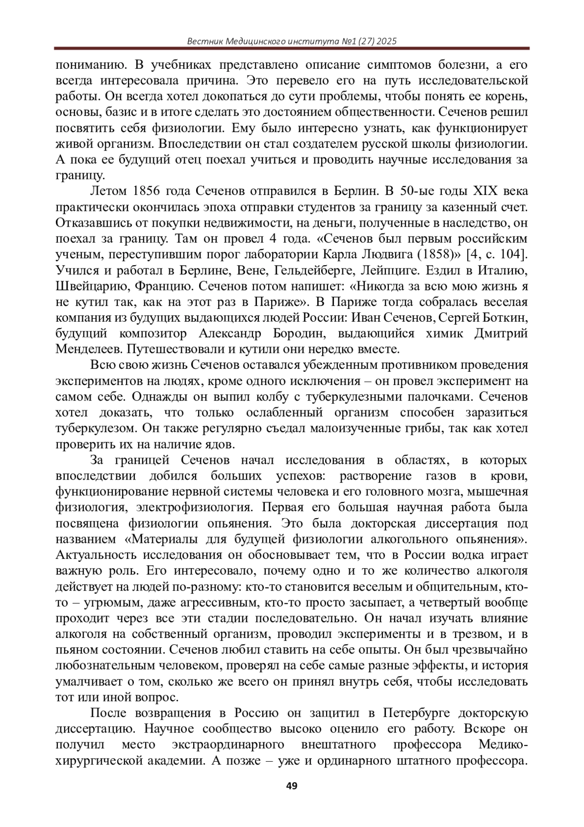 4. Сорокина, Т.С. Иван Михайлович Сеченов в истории российской и мировой физиологии // Вестник Российского университета дружбы народов. - Серия: Медицина. 2014. № 3. - С. 102-112.
