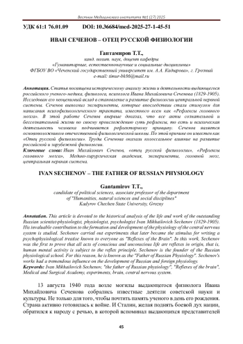 Статья посвящена историческому анализу жизни и деятельности выдающегося российского ученого-медика, физиолога, психолога Ивана Михайловича Сеченова (1829-1905). Исследован его неоценимый вклад в становление и развитие физиологии центральной нервной системы. Сеченов выполнил эксперименты, которые впоследствии стали стимулом для написания психофизиологического трактата, известного всем как «Рефлексы головного мозга». В этой работе Сеченов впервые доказал, что все акты сознательной и бессознательной жизни по своему происхождению суть рефлексы, то есть и психическая деятельность человека подчиняется рефлекторному принципу. Сеченов является основоположником отечественной физиологической школы. По этой причине он известен как «Отец русской физиологии». Труды Сеченова оказали колоссальное влияние на развитие российской и зарубежной физиологии.