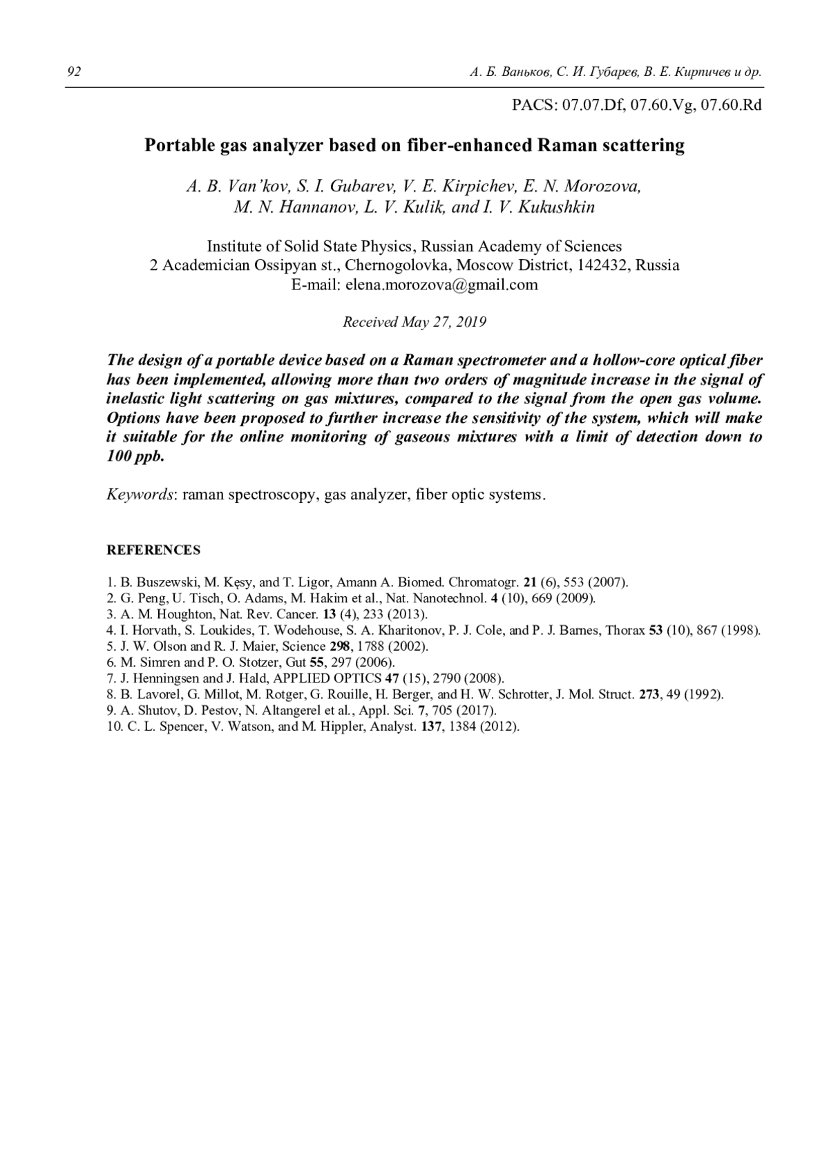 ВАНЬКОВ А. Б., ГУБАРЕВ С. И., КИРПИЧЕВ В. Е., МОРОЗОВА Е. Н., ХАННАНОВ М. Н., КУЛИК Л. В., КУКУШКИН И. В. ПОРТАТИВНЫЙ ГАЗОАНАЛИЗАТОР НА ОСНОВЕ ВОЛОКОННОГО РАМАНОВСКОГО СПЕКТРОМЕТРА // ПРИКЛАДНАЯ ФИЗИКА. 2019. №4