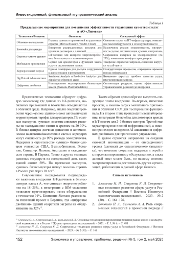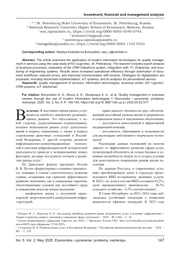 В статье представлен анализ применения современных информационных технологий для управления качеством услуг бизнес-центров, в частности, на примере АО «Лиговка» в г. Санкт-Петербург. Исследование включает экспертный анализ бизнес-процессов, оценку эффективности CRMсистемы Salesforce, интеграции с 1С: Предприятие, а также мониторинг инженерных систем зданий. Результаты демонстрируют повышение операционной эффективности за счет автоматизации документооборота, снижение ошибок и улучшение коммуникации с арендаторами. Предложены стратегии цифровизации, включая внедрение блокчейна, IoT-систем и AI-аналитики для персонализированного обслуживания.