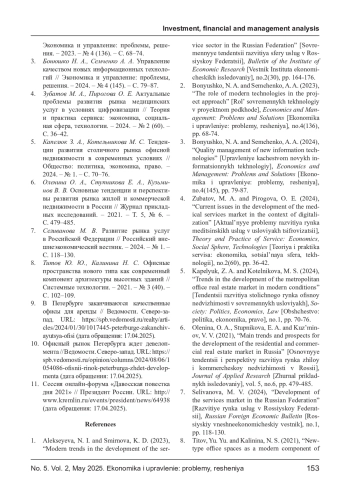 1. Алексеева Н. И., Смирнова К. Д. Современные тенденции развития сферы услуг в Российской Федерации // Вестник Института экономических исследований. - 2023. - № 2 (30). - С. 164-176. EDN: KFUGKY