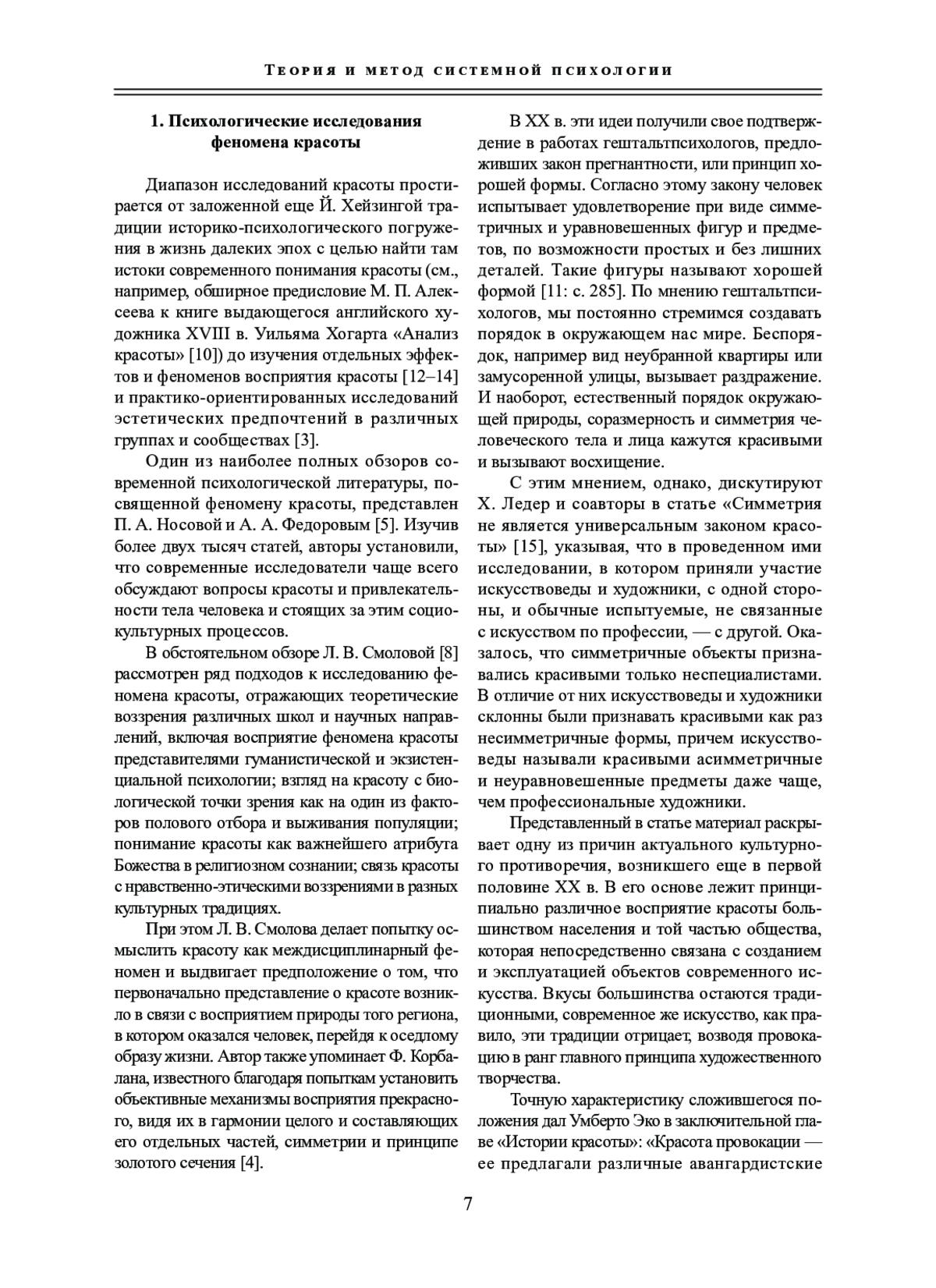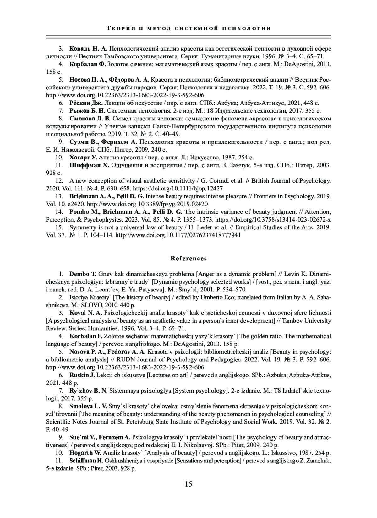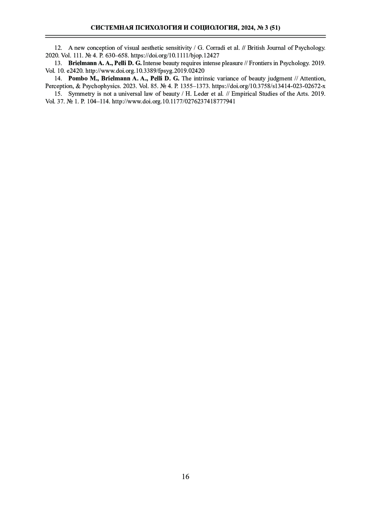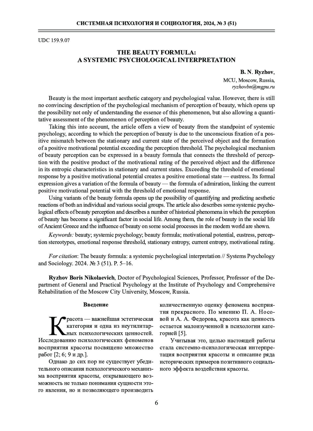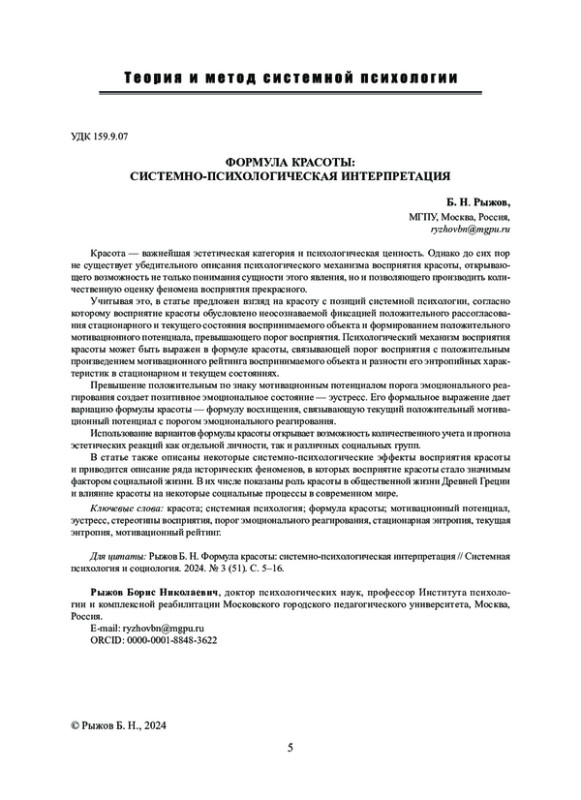 РЫЖОВ Б. Н. ФОРМУЛА КРАСОТЫ: СИСТЕМНО-ПСИХОЛОГИЧЕСКАЯ ИНТЕРПРЕТАЦИЯ // СИСТЕМНАЯ ПСИХОЛОГИЯ И СОЦИОЛОГИЯ. 2024. № 3 (51)
