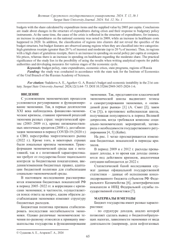 Начало XXI века ознаменовалось различными кризисами экономики, не только влияющими на экономику, но и изменяющими структуру бюджета государства. Бюджетная политика призвана стабилизовать экономику, имея для этого различные инструменты: автоматические и дискреционные стабилизаторы. В работе использованы методы статистического анализа: кластеризация регионов методом k-среднего, расчет статистических показателей, анализ бюджетов с расчетом доли по статьям расходов и в приведенном значении к 2005 г. на душу населения. Сформулированы выводы об изменении структуры расходов в период кризисов и их реагирование на инструменты бюджетной политики. При этом причина кризиса отражается в структуре расходов, например 2009 г. – увеличение расходов на национальную экономику, 2020 г. – на здравоохранение. Кроме того, деление регионов на кластеры не выявило особенностей структуры бюджета, но особенности бюджета наблюдаются среди регионов при делении их на высокий (более 20 % от доходов) и умеренный (до 20 % от доходов) уровни безвозмездных поступлений. Так, в регионах с высокой долей безвозмездных поступлений наблюдается рост расходов на социальную политику на душу населения в сопоставимых ценах, в то время как с умеренной – рост расходов на здравоохранение. Практическая значимость исследования заключается в возможности использовать результаты при написании аналитических докладов для органов государственной власти, а также при разработке мероприятий в различные периоды экономического цикла.Начало XXI века ознаменовалось различными кризисами экономики, не только влияющими на экономику, но и изменяющими структуру бюджета государства. Бюджетная политика призвана стабилизовать экономику, имея для этого различные инструменты: автоматические и дискреционные стабилизаторы. В работе использованы методы статистического анализа: кластеризация регионов методом k-среднего, расчет статистических показателей, анализ бюджетов с расчетом доли по статьям расходов и в приведенном значении к 2005 г. на душу населения. Сформулированы выводы об изменении структуры расходов в период кризисов и их реагирование на инструменты бюджетной политики. При этом причина кризиса отражается в структуре расходов, например 2009 г. – увеличение расходов на национальную экономику, 2020 г. – на здравоохранение. Кроме того, деление регионов на кластеры не выявило особенностей структуры бюджета, но особенности бюджета наблюдаются среди регионов при делении их на высокий (более 20 % от доходов) и умеренный (до 20 % от доходов) уровни безвозмездных поступлений. Так, в регионах с высокой долей безвозмездных поступлений наблюдается рост расходов на социальную политику на душу населения в сопоставимых ценах, в то время как с умеренной – рост расходов на здравоохранение. Практическая значимость исследования заключается в возможности использовать результаты при написании аналитических докладов для органов государственной власти, а также при разработке мероприятий в различные периоды экономического цикла.