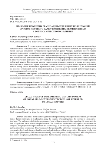В статье отражены правовые проблемы реализации отдельных полномочий органов местного самоуправления, не отнесенных к вопросам местного значения, на примере определения мест для отбывания осужденным исправительных работ. Автором выявлено несоответствие данного полномочия текущей компетенции органов местного самоуправления и отсутствие правового инструментария, позволяющего его эффективно реализовать. Проведен анализ причин и условий возникновения данного полномочия. Предложенным примером проиллюстрированы недостатки в правотворческой деятельности, протекающей в условиях реформирования компетенции органов публичной власти. При помощи метода сравнительно-правового анализа, а также историко-политического вида толкования права отражена динамика изменений компетенции органов публичной власти. Автор кратко анализирует правовое явление, схожее с ультраактивностью, но относящееся не к норме, утратившей силу и применяющейся, а к производной от таковой действующей норме, реализация которой осложнена.