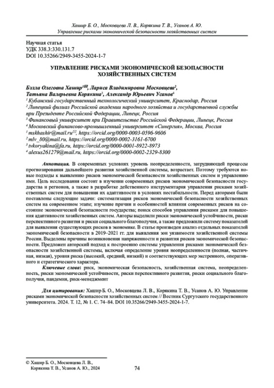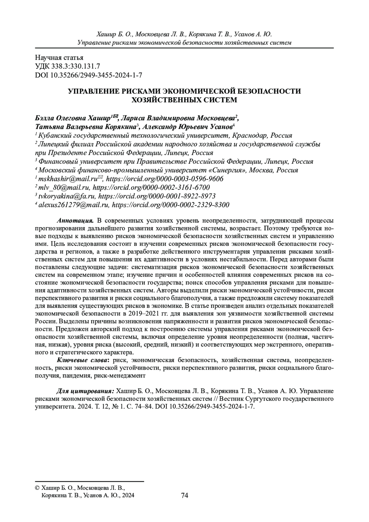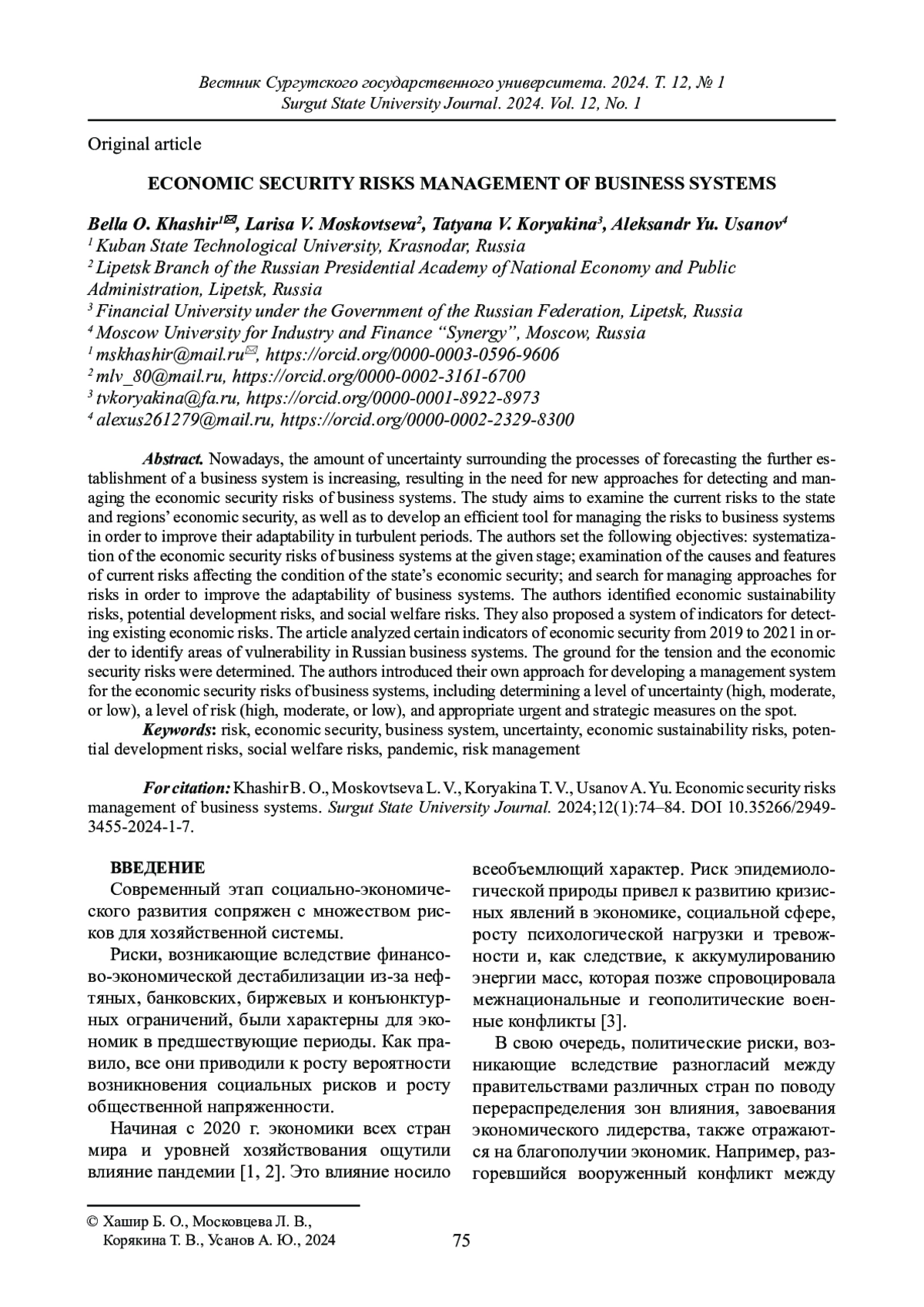 ХАШИР Б. О., МОСКОВЦЕВА Л. В., КОРЯКИНА Т. В., УСАНОВ А. Ю. УПРАВЛЕНИЕ РИСКАМИ ЭКОНОМИЧЕСКОЙ БЕЗОПАСНОСТИ ХОЗЯЙСТВЕННЫХ СИСТЕМ // ВЕСТНИК СУРГУТСКОГО ГОСУДАРСТВЕННОГО УНИВЕРСИТЕТА. 2024. ТОМ 12, № 1
