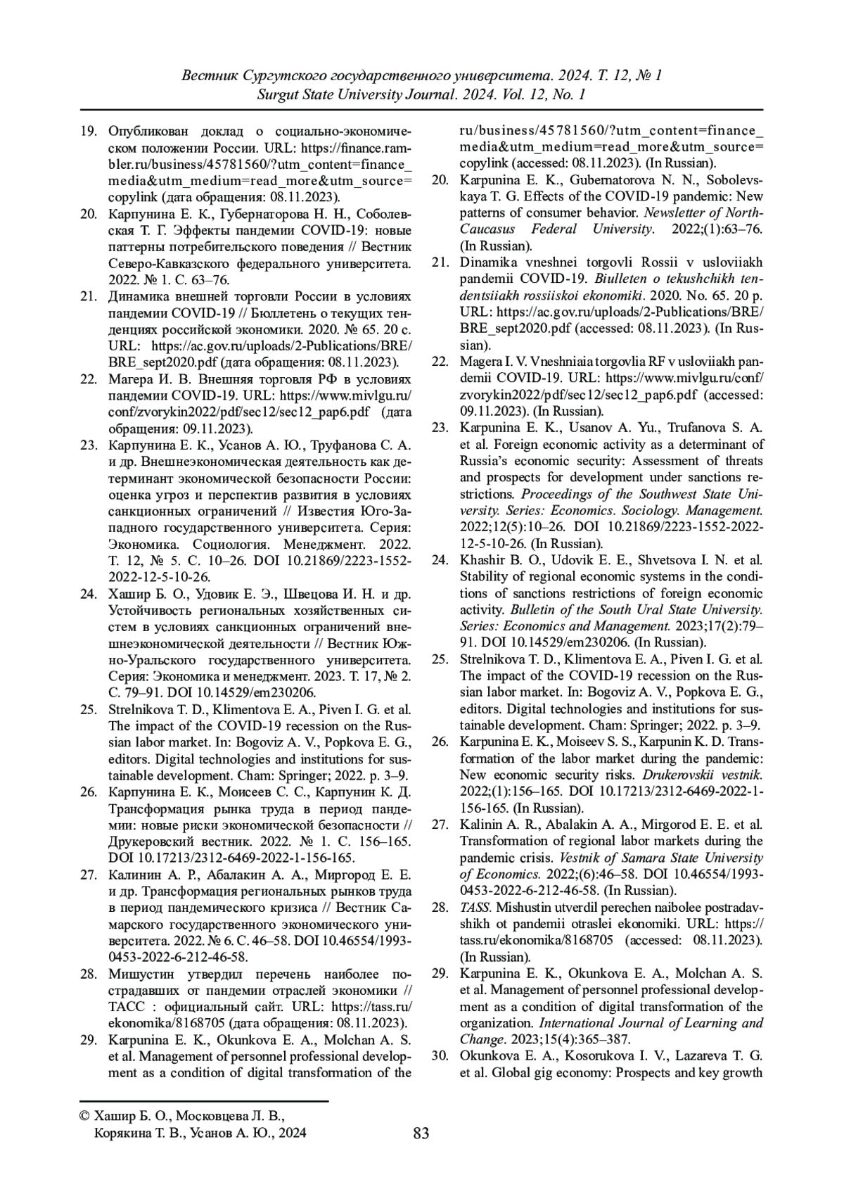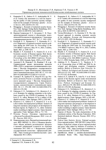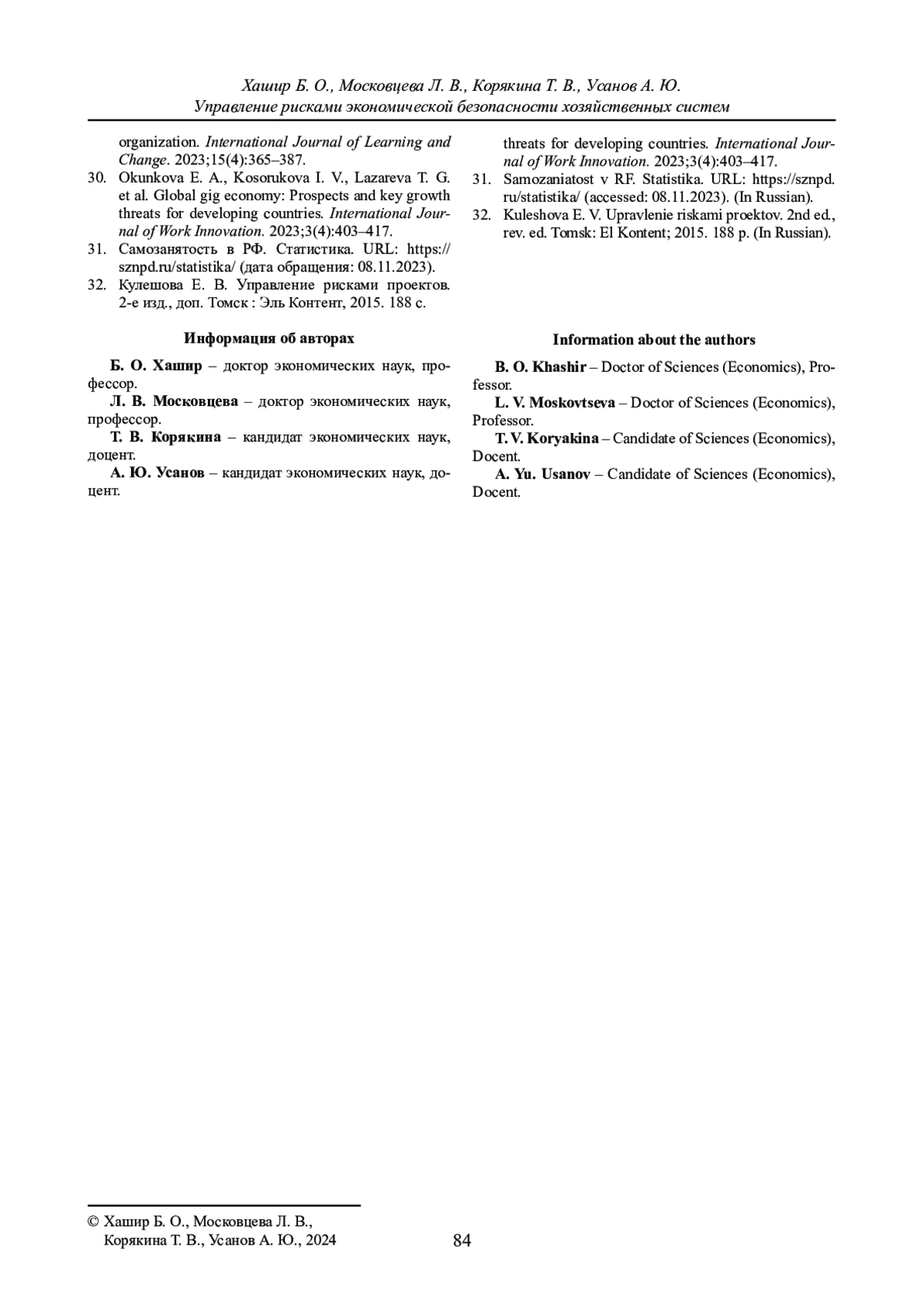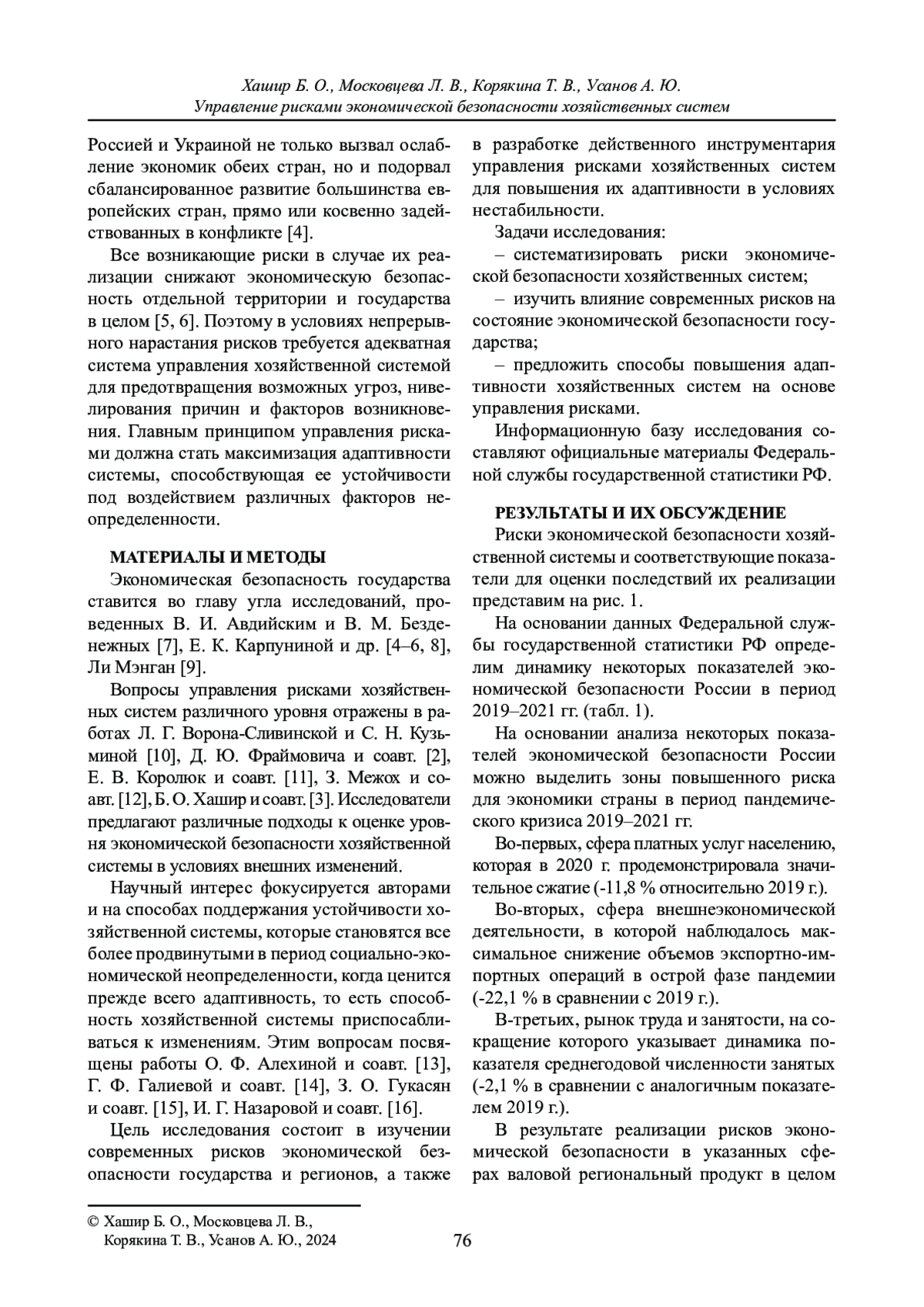 ХАШИР Б. О., МОСКОВЦЕВА Л. В., КОРЯКИНА Т. В., УСАНОВ А. Ю. УПРАВЛЕНИЕ РИСКАМИ ЭКОНОМИЧЕСКОЙ БЕЗОПАСНОСТИ ХОЗЯЙСТВЕННЫХ СИСТЕМ // ВЕСТНИК СУРГУТСКОГО ГОСУДАРСТВЕННОГО УНИВЕРСИТЕТА. 2024. ТОМ 12, № 1