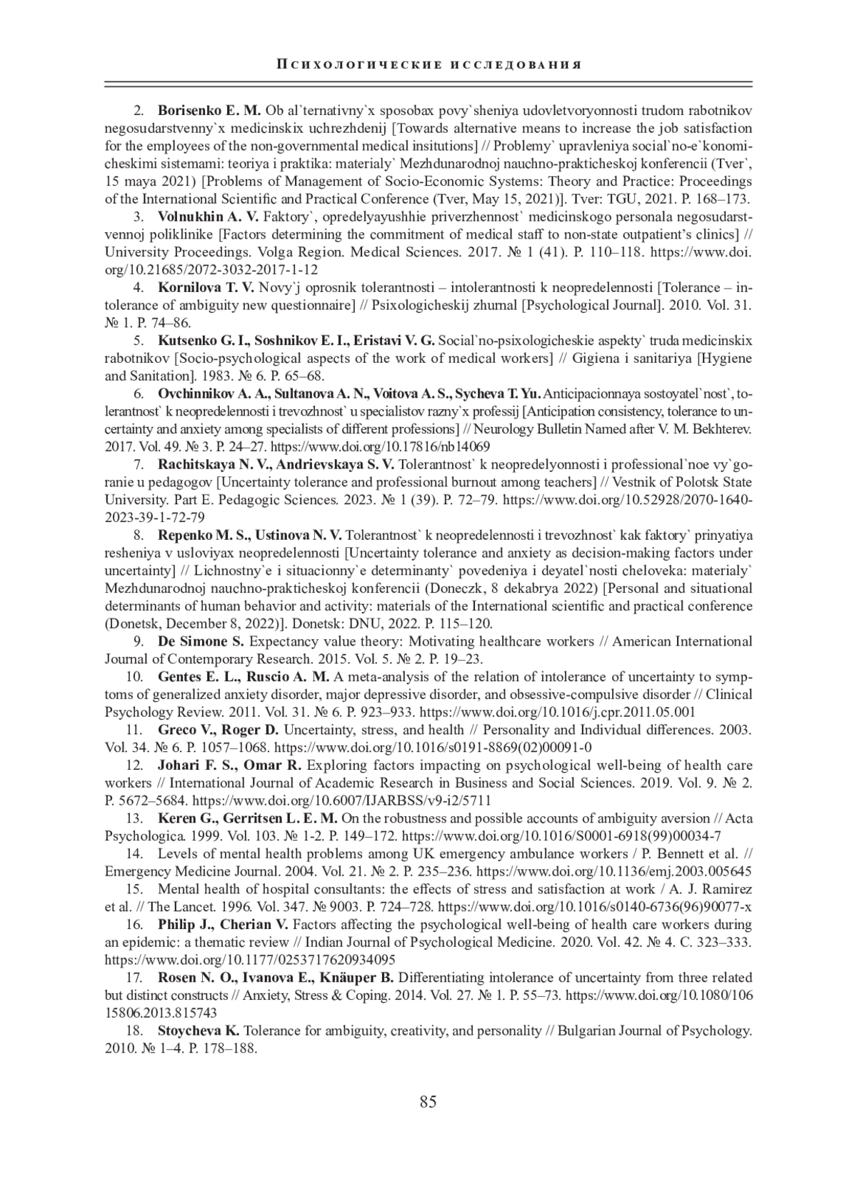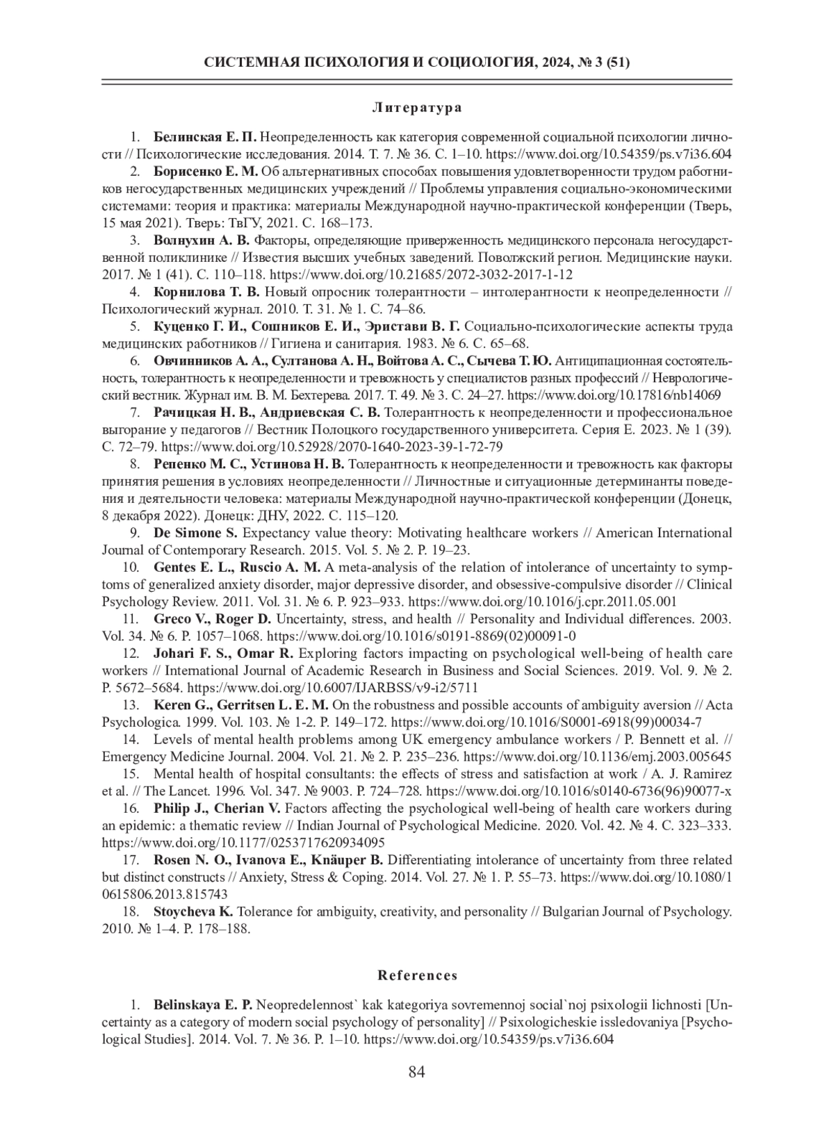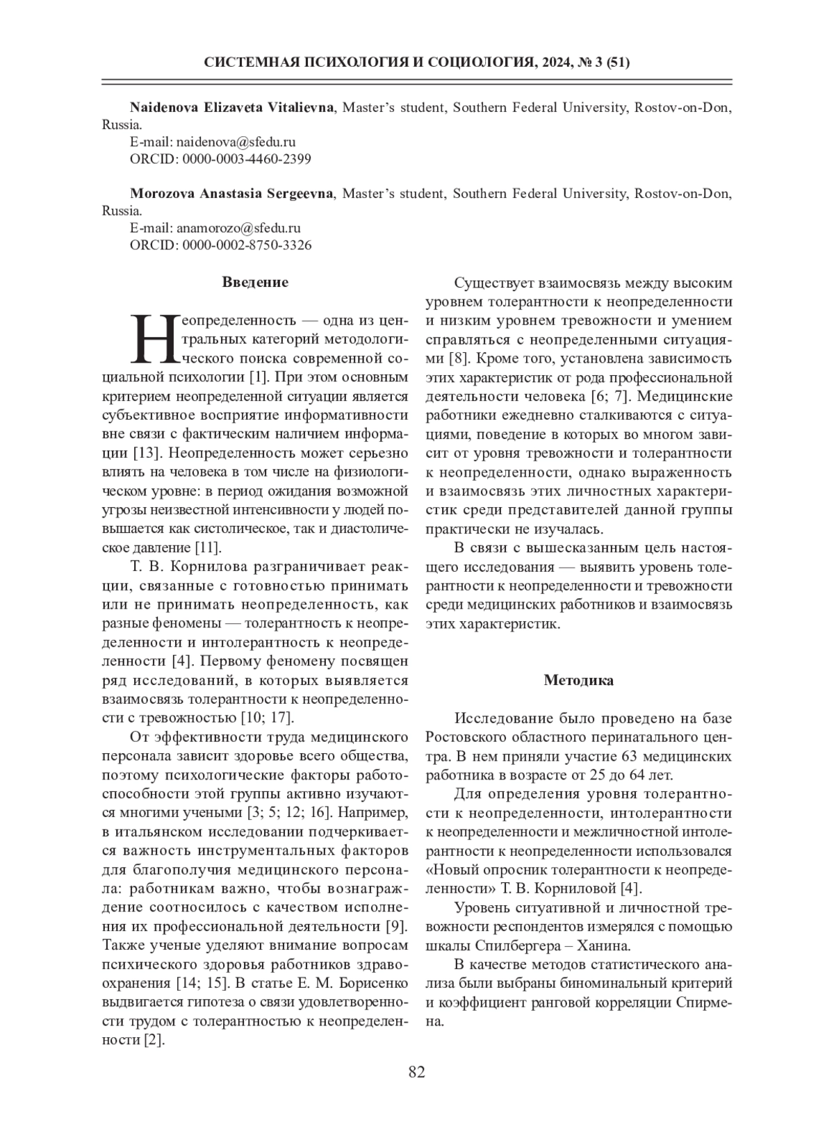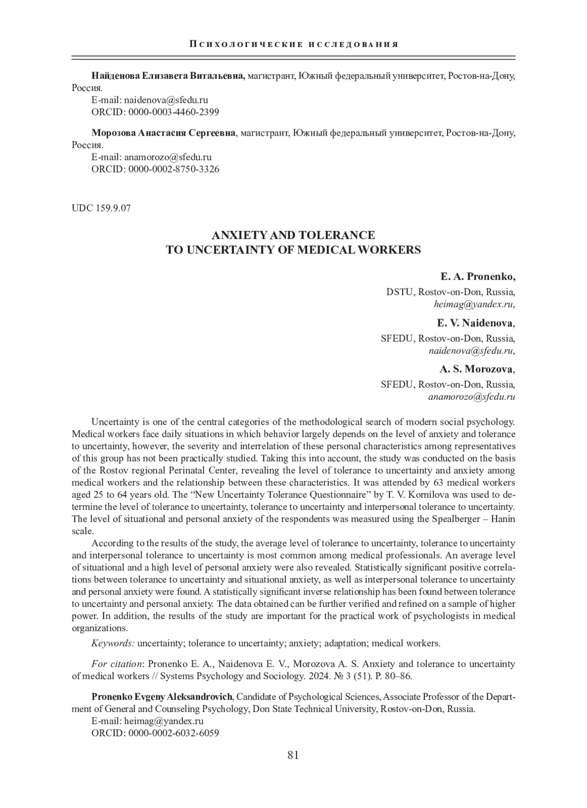 ПРОНЕНКО Е. А., НАЙДЕНОВА Е. В., МОРОЗОВА А. С. ТРЕВОЖНОСТЬ И ТОЛЕРАНТНОСТЬ К НЕОПРЕДЕЛЕННОСТИ МЕДИЦИНСКИХ РАБОТНИКОВ // СИСТЕМНАЯ ПСИХОЛОГИЯ И СОЦИОЛОГИЯ. 2024. № 3 (51)