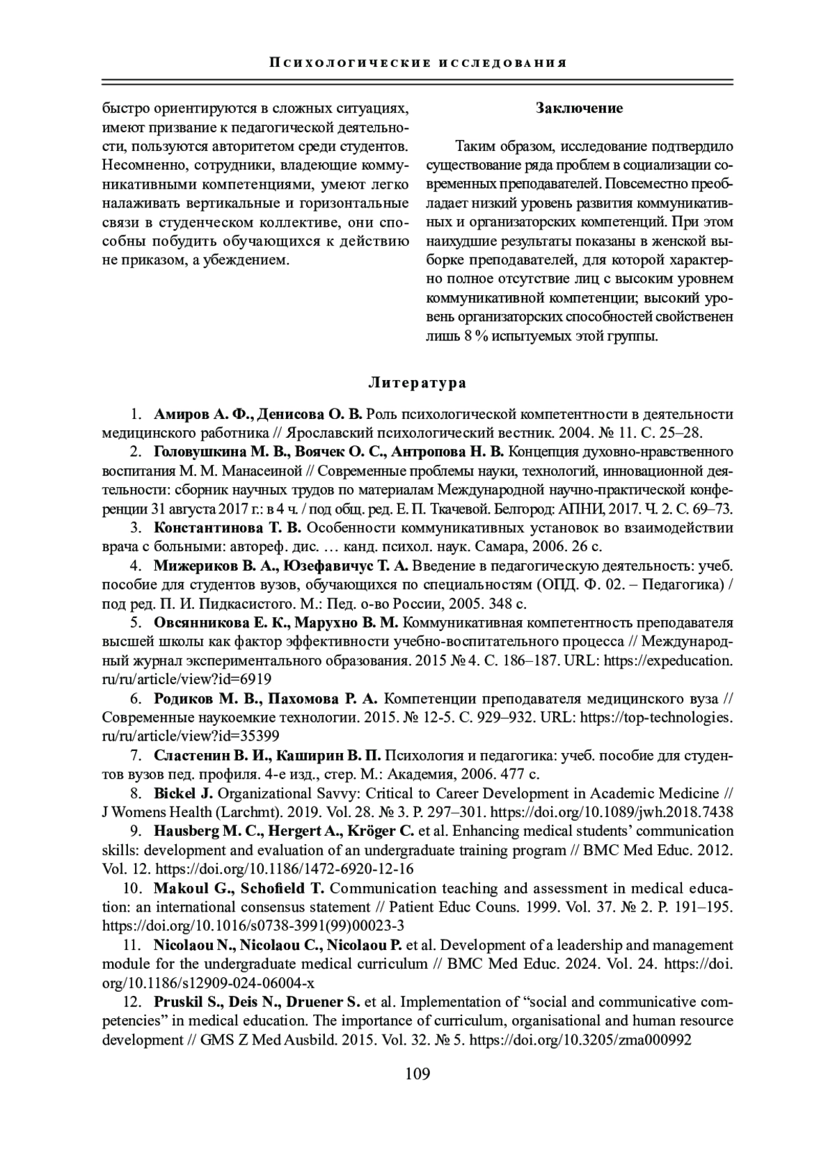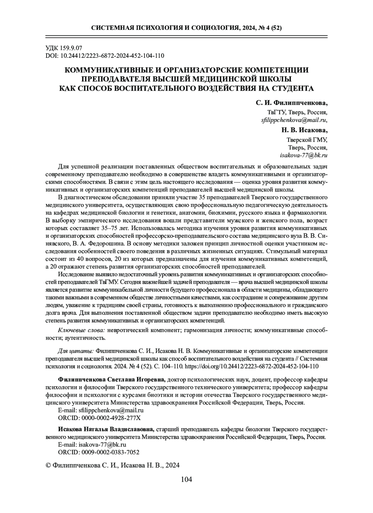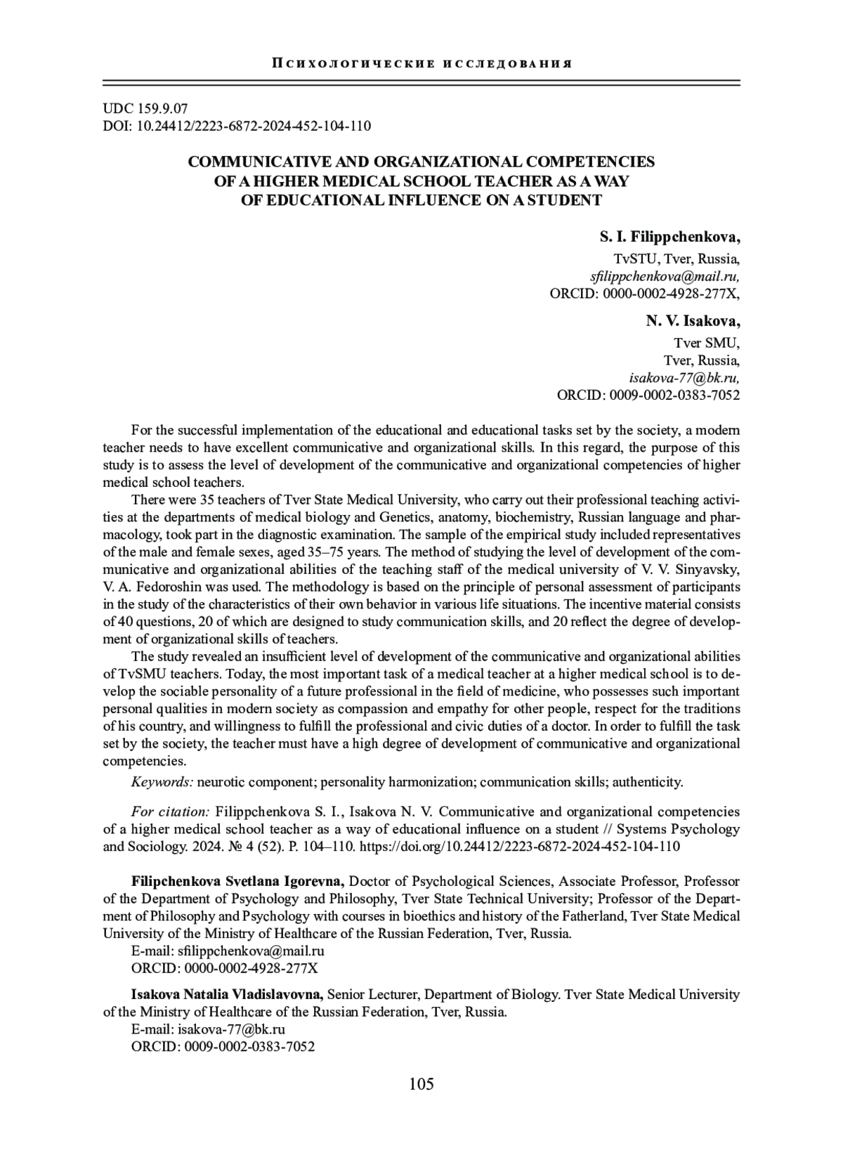 ФИЛИППЧЕНКОВА С. И., ИСАКОВА Н. В. КОММУНИКАТИВНЫЕ И ОРГАНИЗАТОРСКИЕ КОМПЕТЕНЦИИ ПРЕПОДАВАТЕЛЯ ВЫСШЕЙ МЕДИЦИНСКОЙ ШКОЛЫ КАК СПОСОБ ВОСПИТАТЕЛЬНОГО ВОЗДЕЙСТВИЯ НА СТУДЕНТА // СИСТЕМНАЯ ПСИХОЛОГИЯ И СОЦИОЛОГИЯ. 2024. № 4 (52)