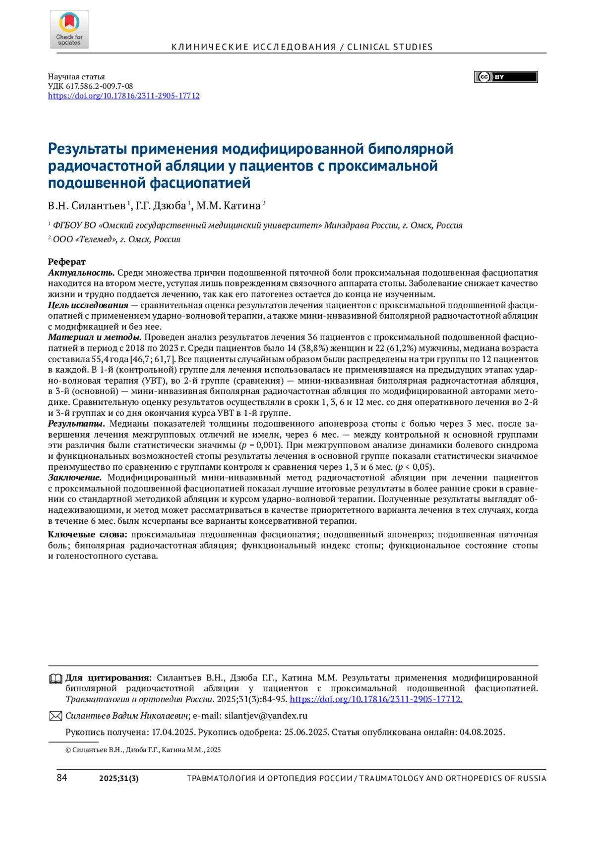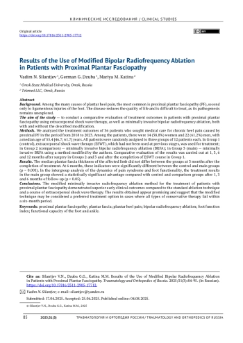 Заключение. Модифицированный мини-инвазивный метод радиочастотной абляции при лечении пациентов с проксимальной подошвенной фасциопатией показал лучшие итоговые результаты в более ранние сроки в сравнении со стандартной методикой абляции и курсом ударно-волновой терапии. Полученные результаты выглядят обнадеживающими, и метод может рассматриваться в качестве приоритетного варианта лечения в тех случаях, когда в течение 6 мес. были исчерпаны все варианты консервативной терапии.