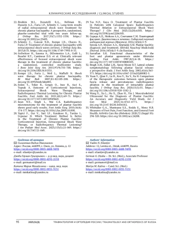 22. Ibrahim M.I., Donatelli R.A., Hellman M., Hussein A.Z., Furia J.P., Schmitz C. Long-term results of radial extracorporeal shock wave treatment for chronic plantar fasciopathy: A prospective, randomized, placebo-controlled trial with two years follow-up. J Orthop Res. 2017;35(7):1532-1538. DOI: 10.1002/jor.23403