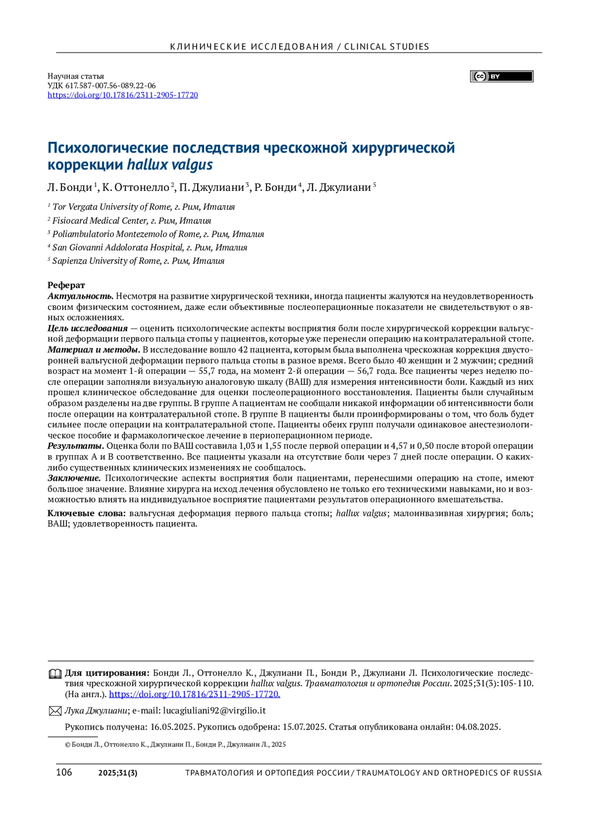 Заключение. Психологические аспекты восприятия боли пациентами, перенесшими операцию на стопе, имеют большое значение. Влияние хирурга на исход лечения обусловлено не только его техническими навыками, но и возможностью влиять на индивидуальное восприятие пациентами результатов операционного вмешательства.