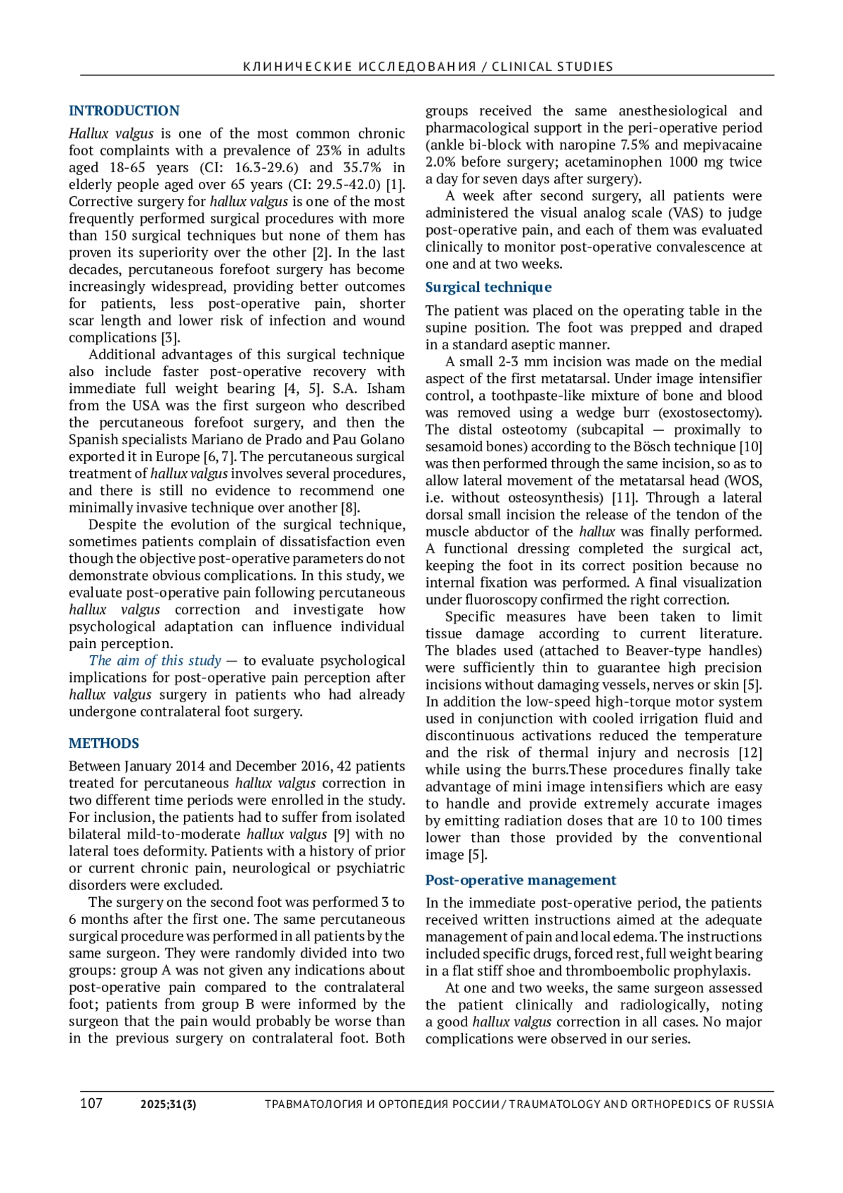 Цель исследования — оценить психологические аспекты восприятия боли после хирургической коррекции вальгусной деформации первого пальца стопы у пациентов, которые уже перенесли операцию на контралатеральной стопе.