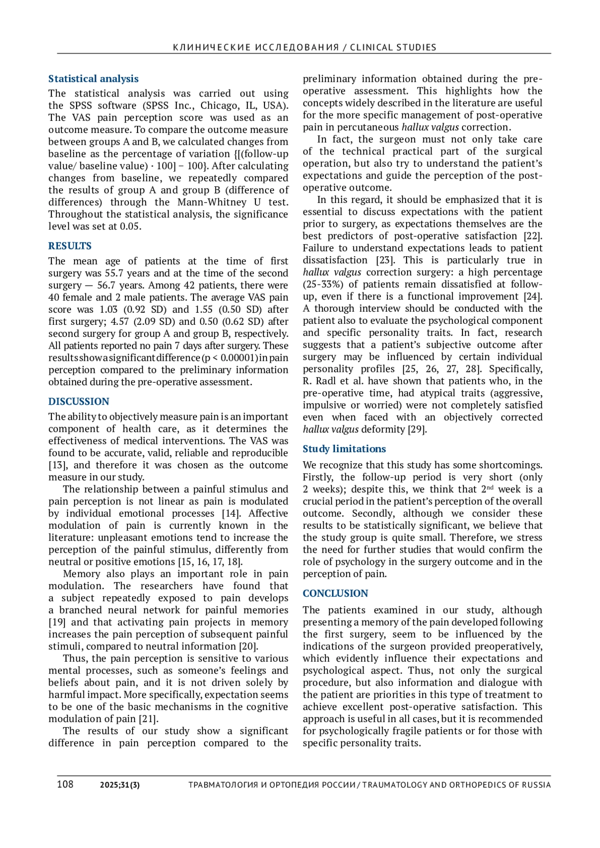 Conclusion. We observed the great importance of psychological implications for pain perception in patients undergoing foot surgery. The role of a surgeon is related not only to technical skills, but it is also conditioned by their ability to drive patients’ individual perception of post-operative outcome.