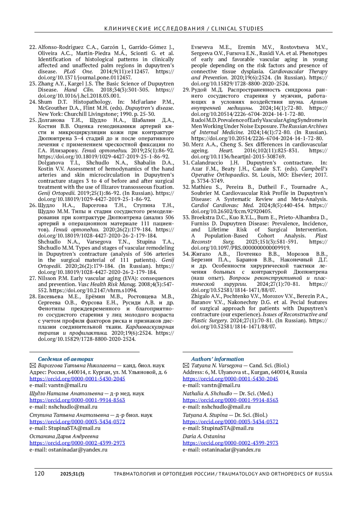 26. Щудло Н.А., Варсегова Т.Н., Ступина Т.Н., Щудло М.М. Типы и стадии сосудистого ремоделирования при контрактуре Дюпюитрена (анализ 506 артерий в операционном материале 111 пациентов). Гений ортопедии. 2020;26(2):179-184.