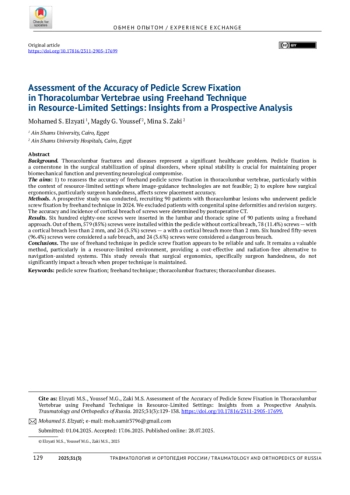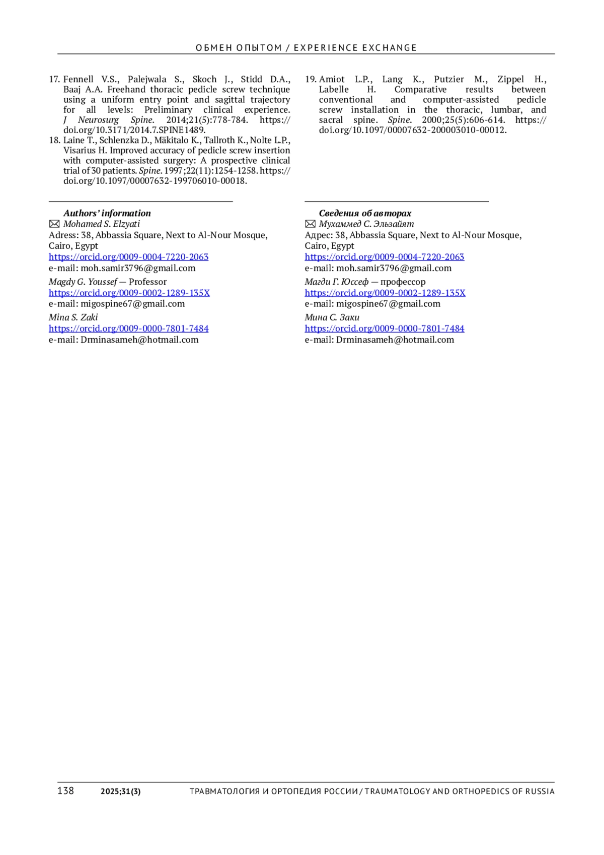 13. Моти-Лангруди Р., Садегян Х. Оценка точности установки транспедикулярных винтов в грудопояснично-крестцовом отделе позвоночника с помощью мануальной техники и боковой рентгеноскопии: результаты послеоперационной компьютерной томографии у 114 пациентов. Spine J. 2015;15(4):700-704. DOI: 10.1016/j.spinee.2014.12.012
