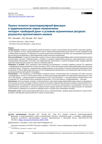 Заключение. Использование техники «свободной руки» при транспедикулярной фиксации является надежным и безопасным методом, который особенно полезен в условиях ограниченных ресурсов, являясь экономичной и безрадиационной альтернативой навигационным системам. Результаты проведенного исследования показали, что хирургическая эргономика, в частности предпочтение хирурга работать левой или правой рукой, не оказывает существенного влияния на успешность хирургического лечения при соблюдении техники.