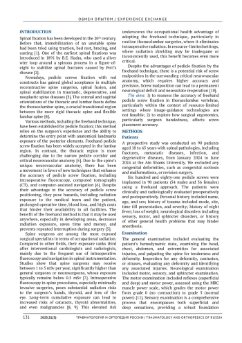 Материал и методы. Было проведено проспективное исследование, в котором приняли участие 90 пациентов с поражениями грудопоясничного отдела, которым в 2024 г. была выполнена транспедикулярная фиксация методом «свободной руки». Пациенты с врожденными деформациями позвоночника и предшествующими ревизиями были исключены. Точность фиксации винтов и частота повреждений кортикального слоя определяли при помощи послеоперационной компьютерной томографии.