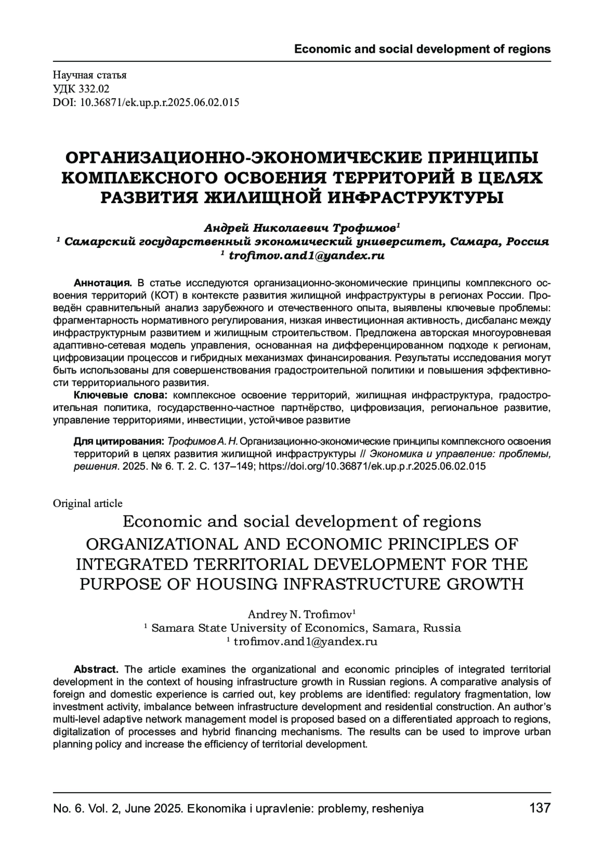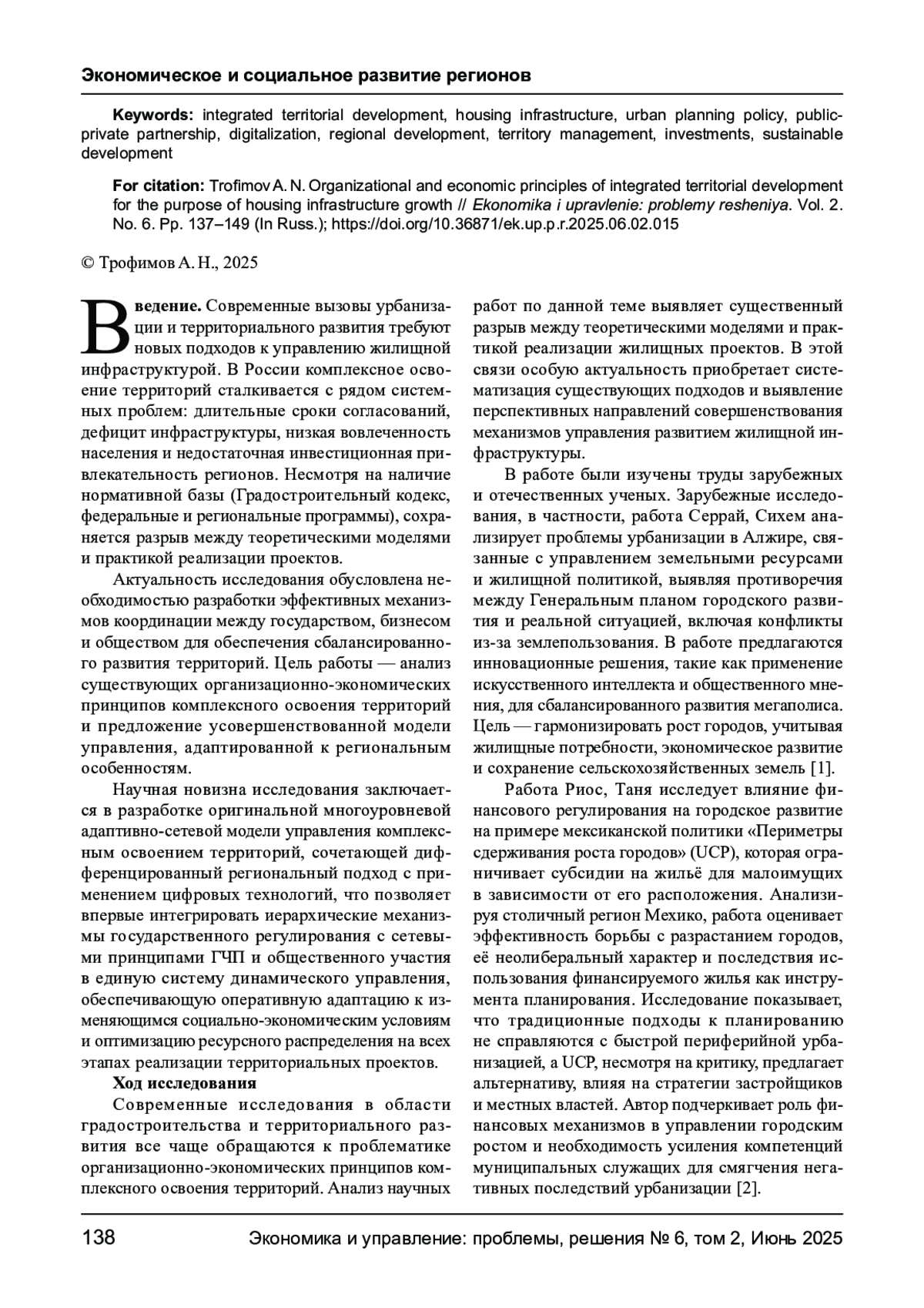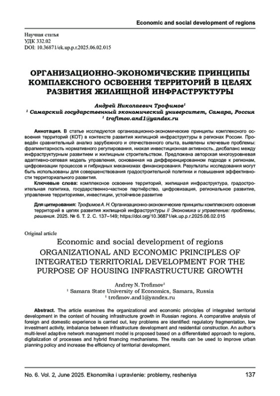 ТРОФИМОВ А. Н. ОРГАНИЗАЦИОННО-ЭКОНОМИЧЕСКИЕ ПРИНЦИПЫ КОМПЛЕКСНОГО ОСВОЕНИЯ ТЕРРИТОРИЙ В ЦЕЛЯХ РАЗВИТИЯ ЖИЛИЩНОЙ ИНФРАСТРУКТУРЫ // ЭКОНОМИКА И УПРАВЛЕНИЕ: ПРОБЛЕМЫ, РЕШЕНИЯ. 2025. ТОМ 2 № 6