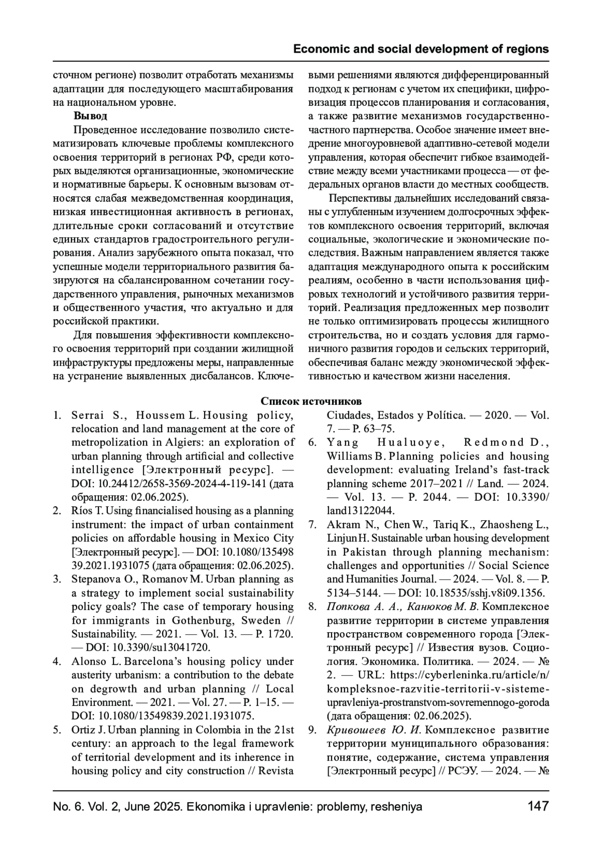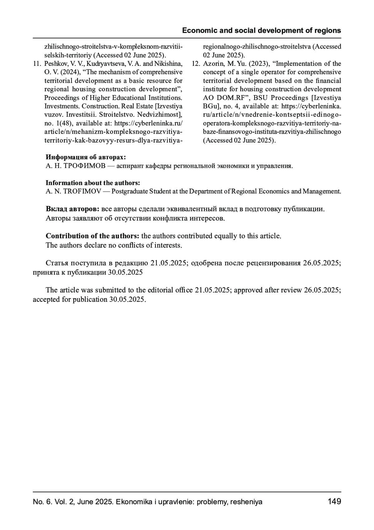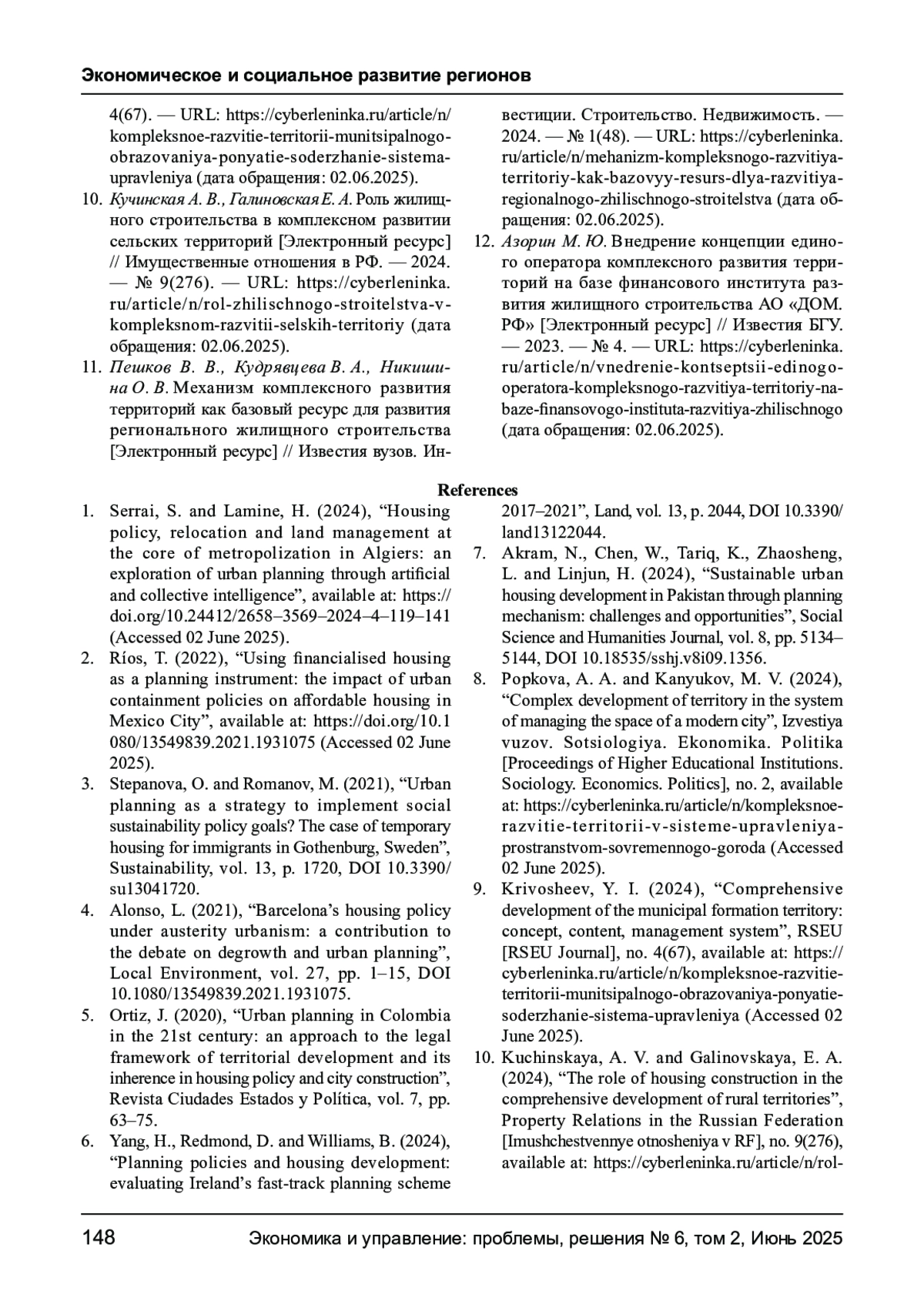 ТРОФИМОВ А. Н. ОРГАНИЗАЦИОННО-ЭКОНОМИЧЕСКИЕ ПРИНЦИПЫ КОМПЛЕКСНОГО ОСВОЕНИЯ ТЕРРИТОРИЙ В ЦЕЛЯХ РАЗВИТИЯ ЖИЛИЩНОЙ ИНФРАСТРУКТУРЫ // ЭКОНОМИКА И УПРАВЛЕНИЕ: ПРОБЛЕМЫ, РЕШЕНИЯ. 2025. ТОМ 2 № 6