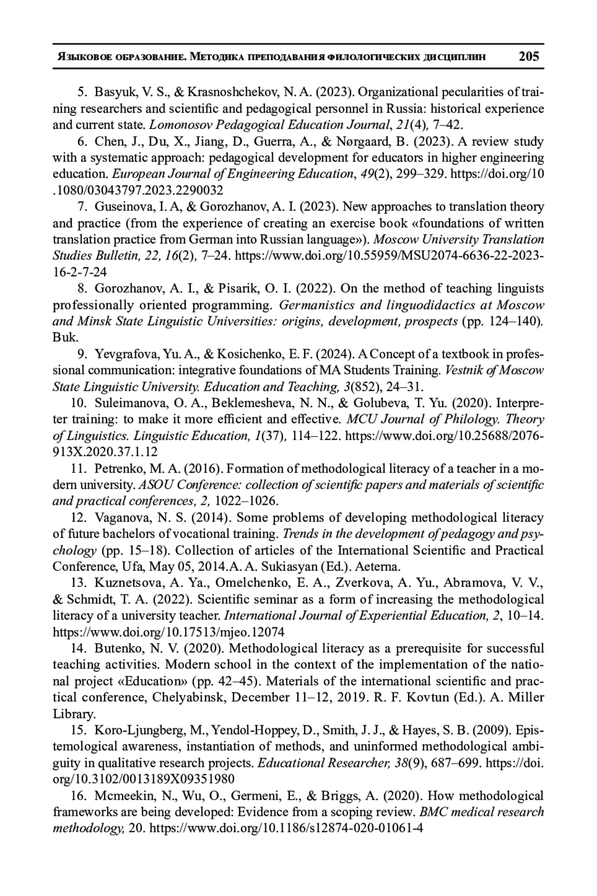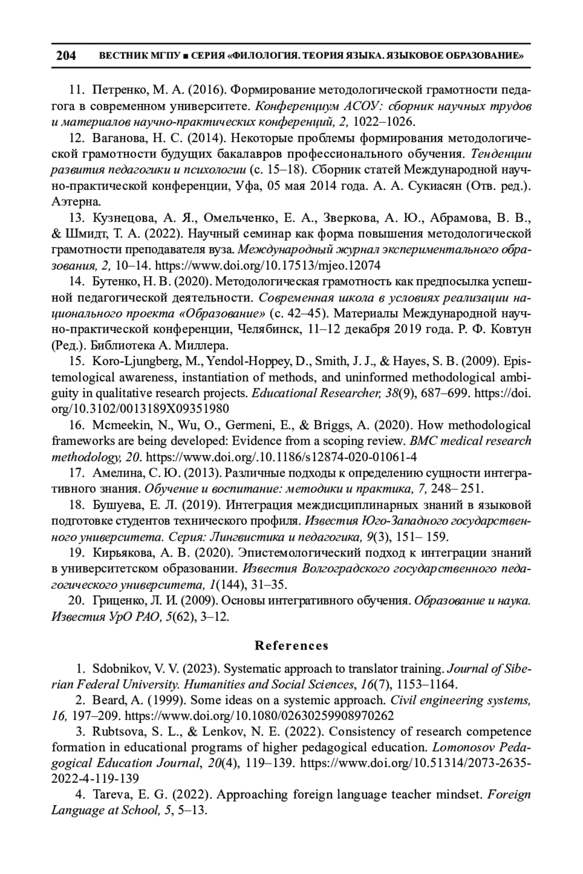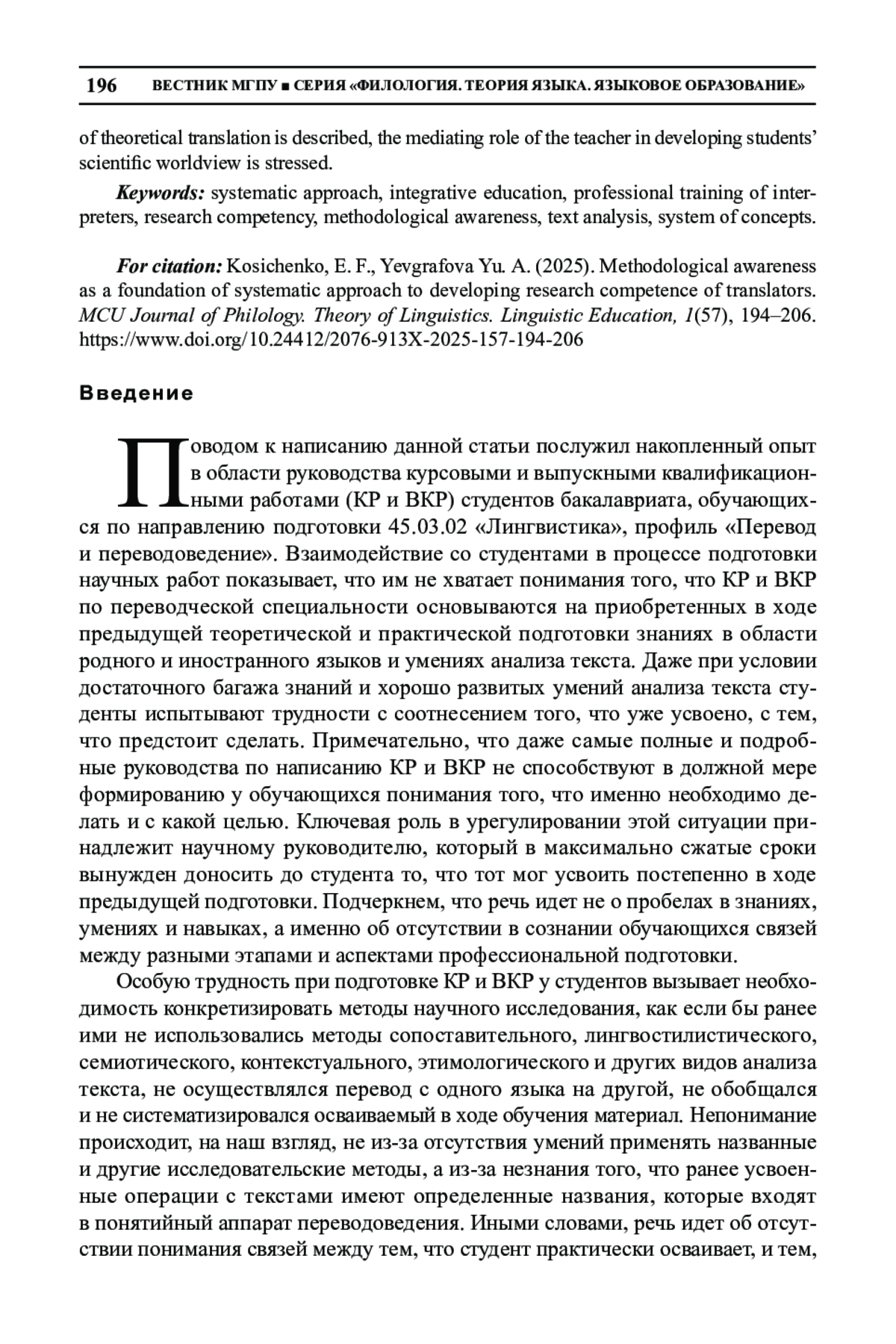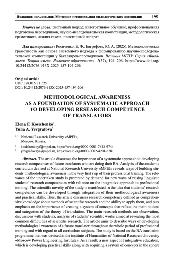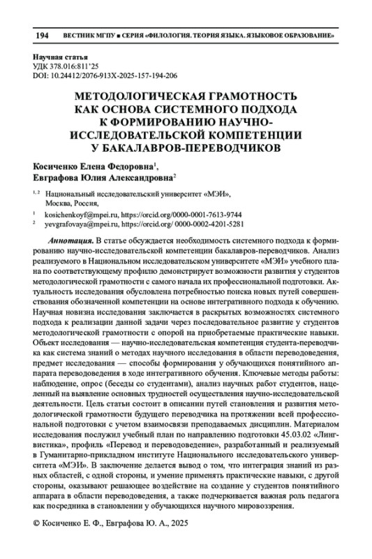 КОСИЧЕНКО Е. Ф., ЕВГРАФОВА Ю. А. МЕТОДОЛОГИЧЕСКАЯ ГРАМОТНОСТЬ КАК ОСНОВА СИСТЕМНОГО ПОДХОДА К ФОРМИРОВАНИЮ НАУЧНО-ИССЛЕДОВАТЕЛЬСКОЙ КОМПЕТЕНЦИИ У БАКАЛАВРОВ-ПЕРЕВОДЧИКОВ // ВЕСТНИК МГПУ. СЕРИЯ: ФИЛОЛОГИЯ. ТЕОРИЯ ЯЗЫКА. ЯЗЫКОВОЕ ОБРАЗОВАНИЕ. 2025. № 1 (57)