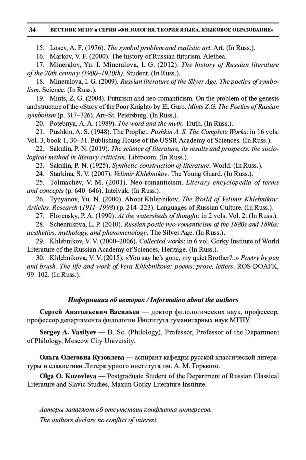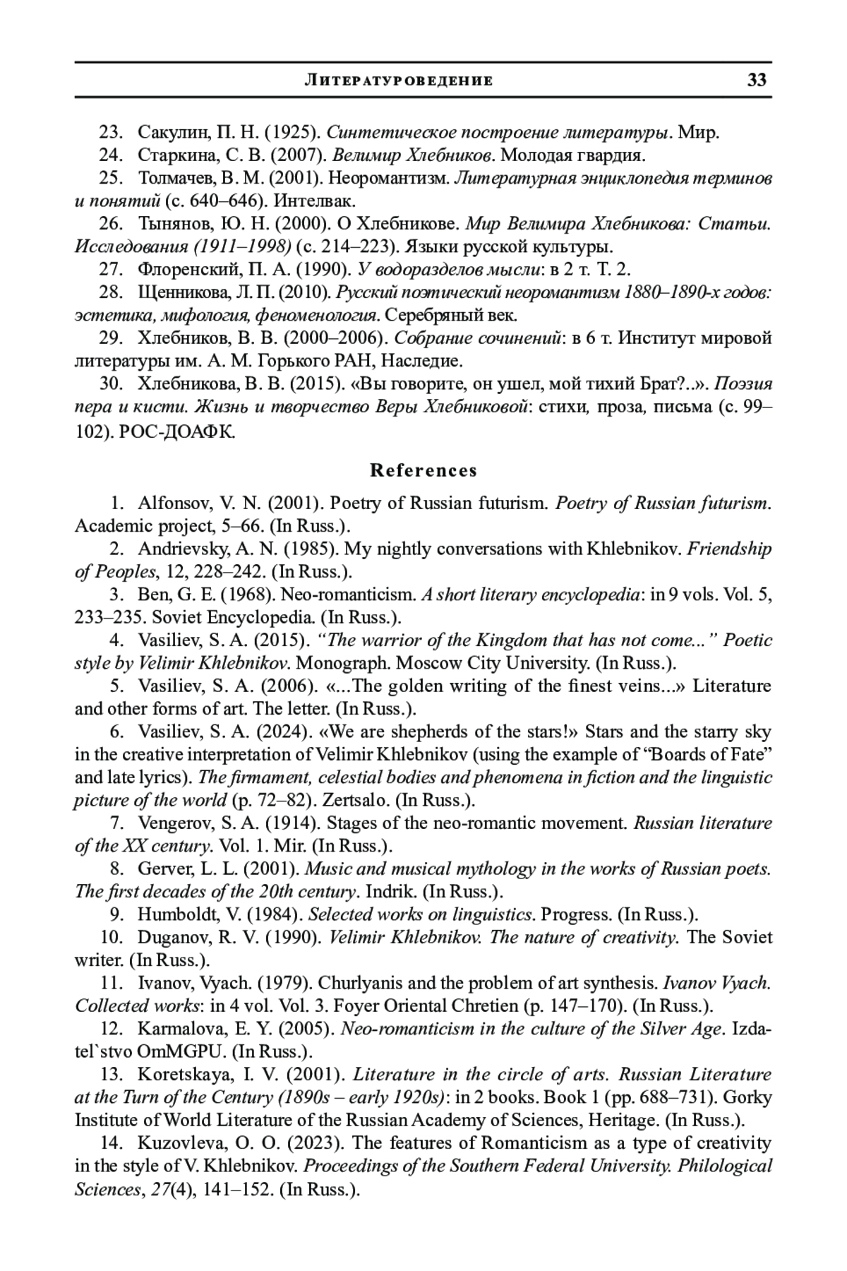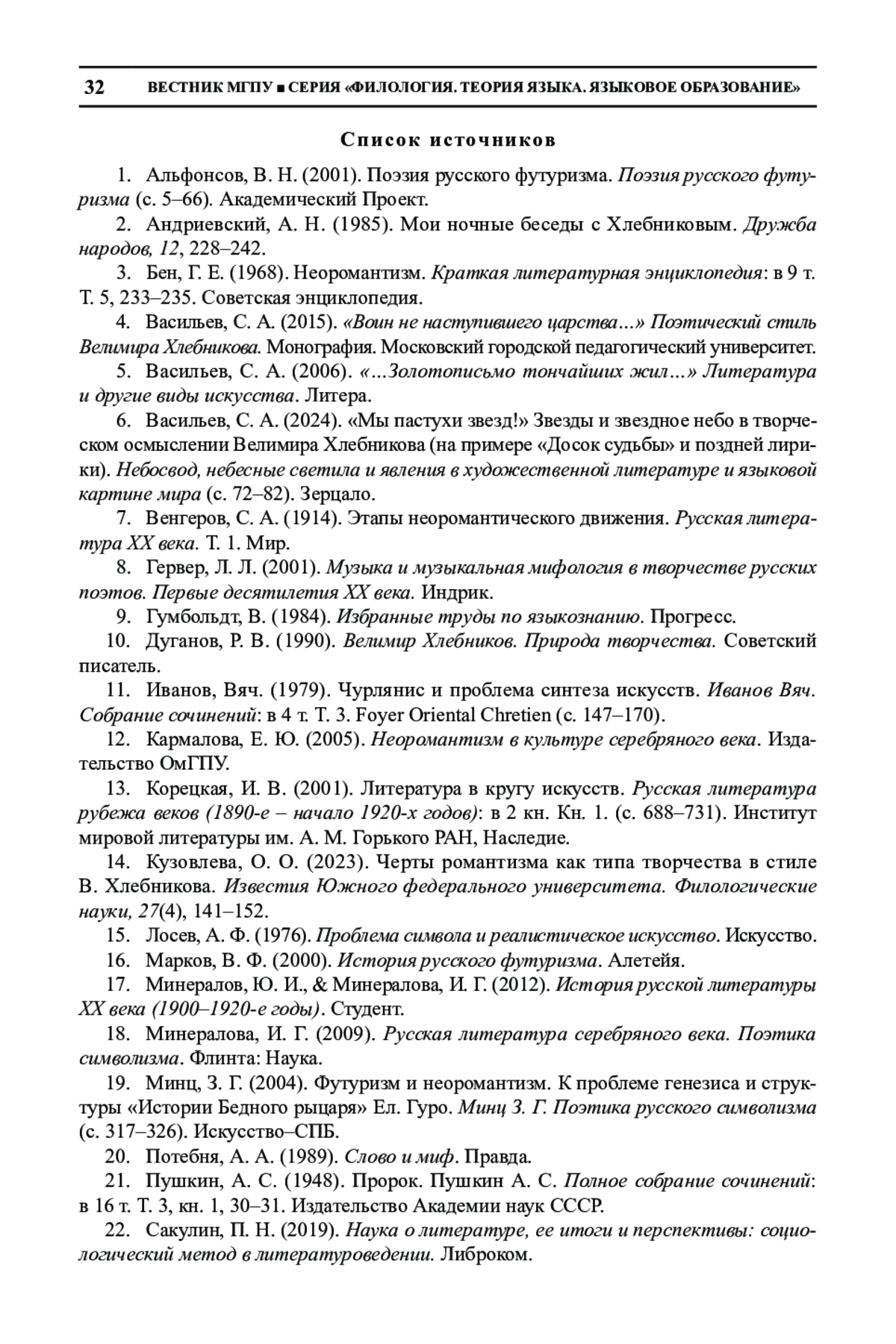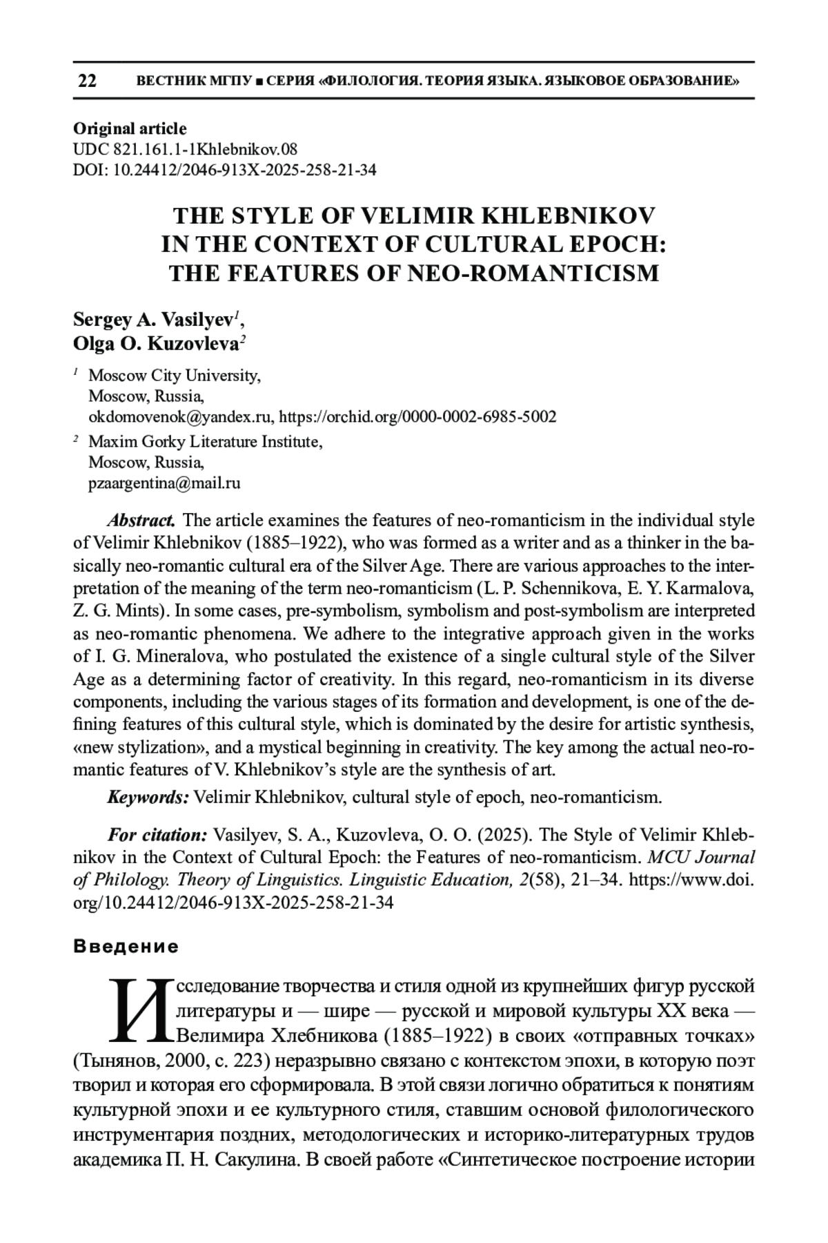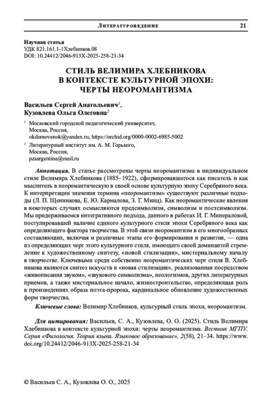 ВАСИЛЬЕВ С. А., КУЗОВЛЕВА О. О. СТИЛЬ ВЕЛИМИРА ХЛЕБНИКОВА В КОНТЕКСТЕ КУЛЬТУРНОЙ ЭПОХИ: ЧЕРТЫ НЕОРОМАНТИЗМА // ВЕСТНИК МГПУ. СЕРИЯ: ФИЛОЛОГИЯ. ТЕОРИЯ ЯЗЫКА. ЯЗЫКОВОЕ ОБРАЗОВАНИЕ. 2025. № 2 (58)