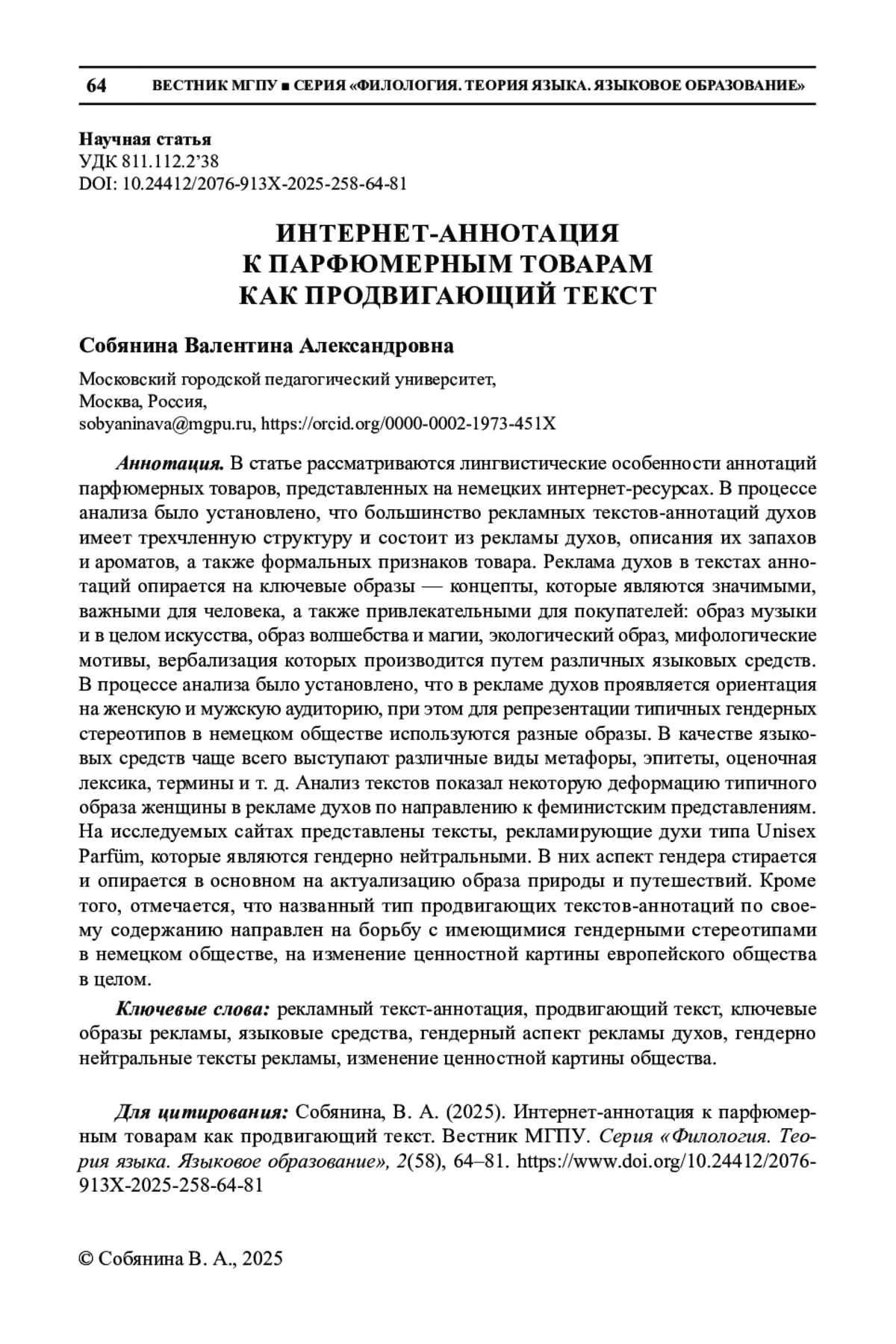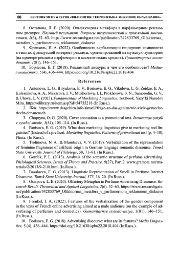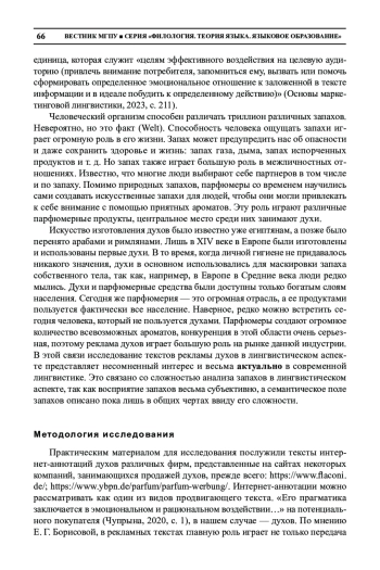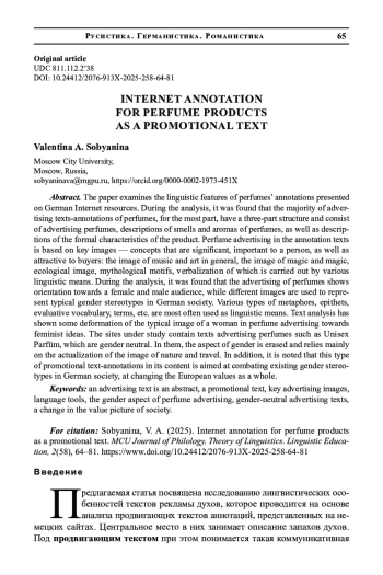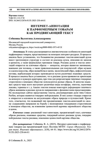 В статье рассматриваются лингвистические особенности аннотаций парфюмерных товаров, представленных на немецких интернет-ресурсах. В процессе анализа было установлено, что большинство рекламных текстов-аннотаций духов имеет трехчленную структуру и состоит из рекламы духов, описания их запахов и ароматов, а также формальных признаков товара. Реклама духов в текстах аннотаций опирается на ключевые образы - концепты, которые являются значимыми, важными для человека, а также привлекательными для покупателей: образ музыки и в целом искусства, образ волшебства и магии, экологический образ, мифологические мотивы, вербализация которых производится путем различных языковых средств.