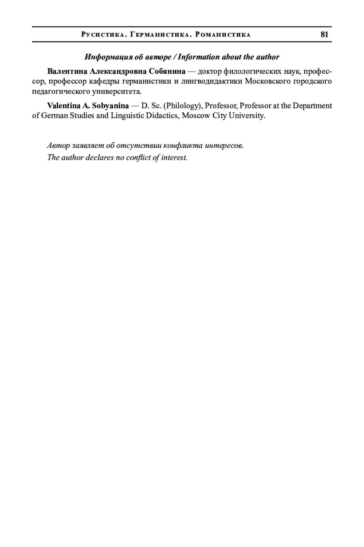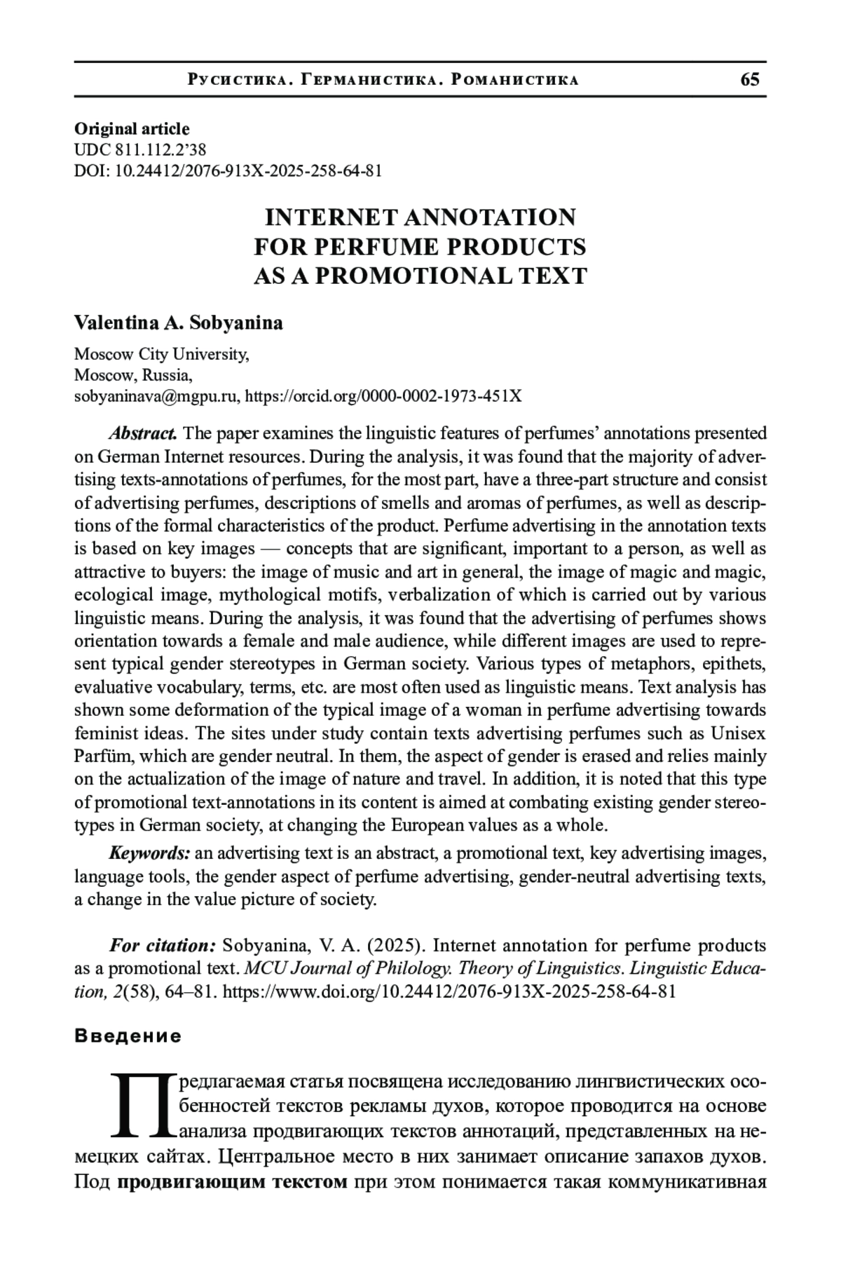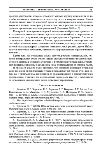 В процессе анализа было установлено, что в рекламе духов проявляется ориентация на женскую и мужскую аудиторию, при этом для репрезентации типичных гендерных стереотипов в немецком обществе используются разные образы. В качестве языковых средств чаще всего выступают различные виды метафоры, эпитеты, оценочная лексика, термины и т. д. Анализ текстов показал некоторую деформацию типичного образа женщины в рекламе духов по направлению к феминистским представлениям. На исследуемых сайтах представлены тексты, рекламирующие духи типа Unisex Pafum, которые являются гендерно нейтральными. В них аспект гендера стирается и опирается в основном на актуализацию образа природы и путешествий. Кроме того, отмечается, что названный тип продвигающих текстов-аннотаций по своему содержанию направлен на борьбу с имеющимися тендерными стереотипами в немецком обществе, на изменение ценностной картины европейского общества в целом.