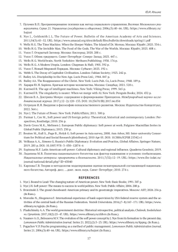 6. Наумов А. О., Белоусова М. В. Эволюция концепции «мягкой силы» Дж. Ная: от рождения идеи до наших дней. Вестник Московского университета. Серия 21. Управление (государство и общество). 2022;(2):3-23. URL: https://www.elibrary.ru/itppng