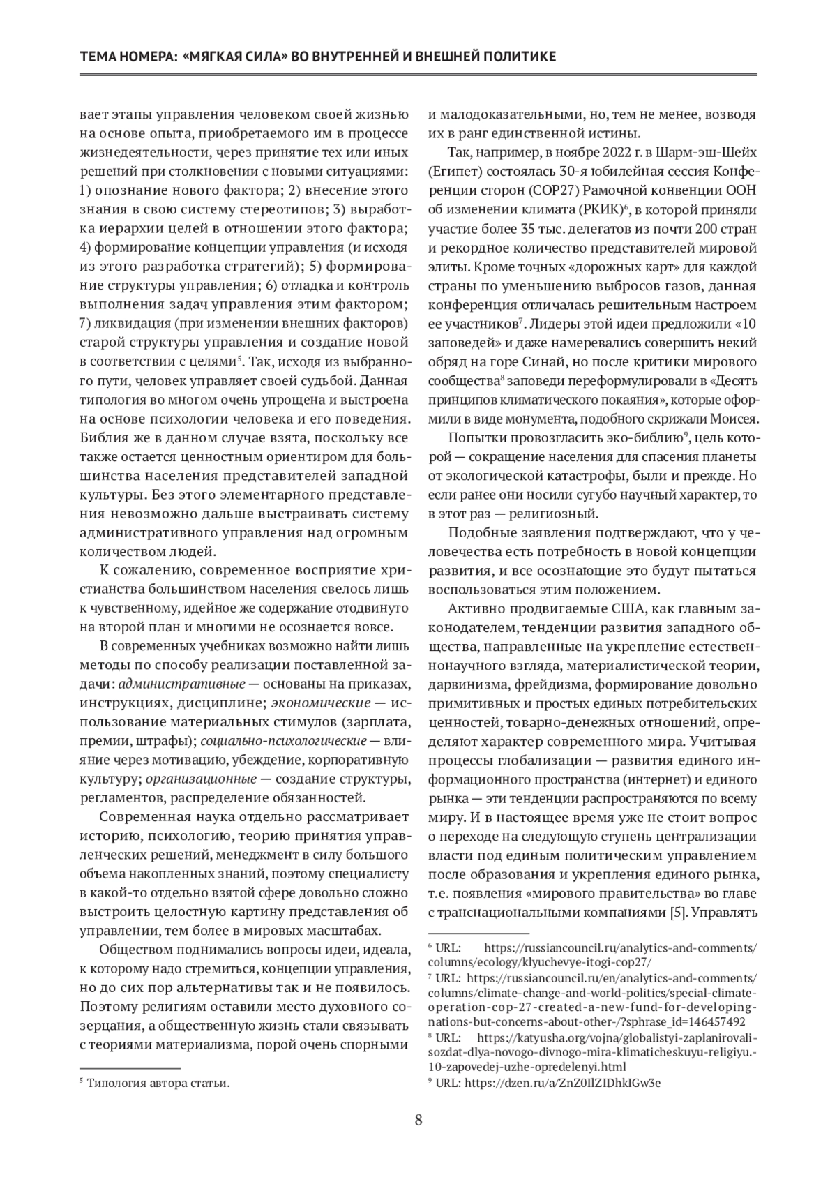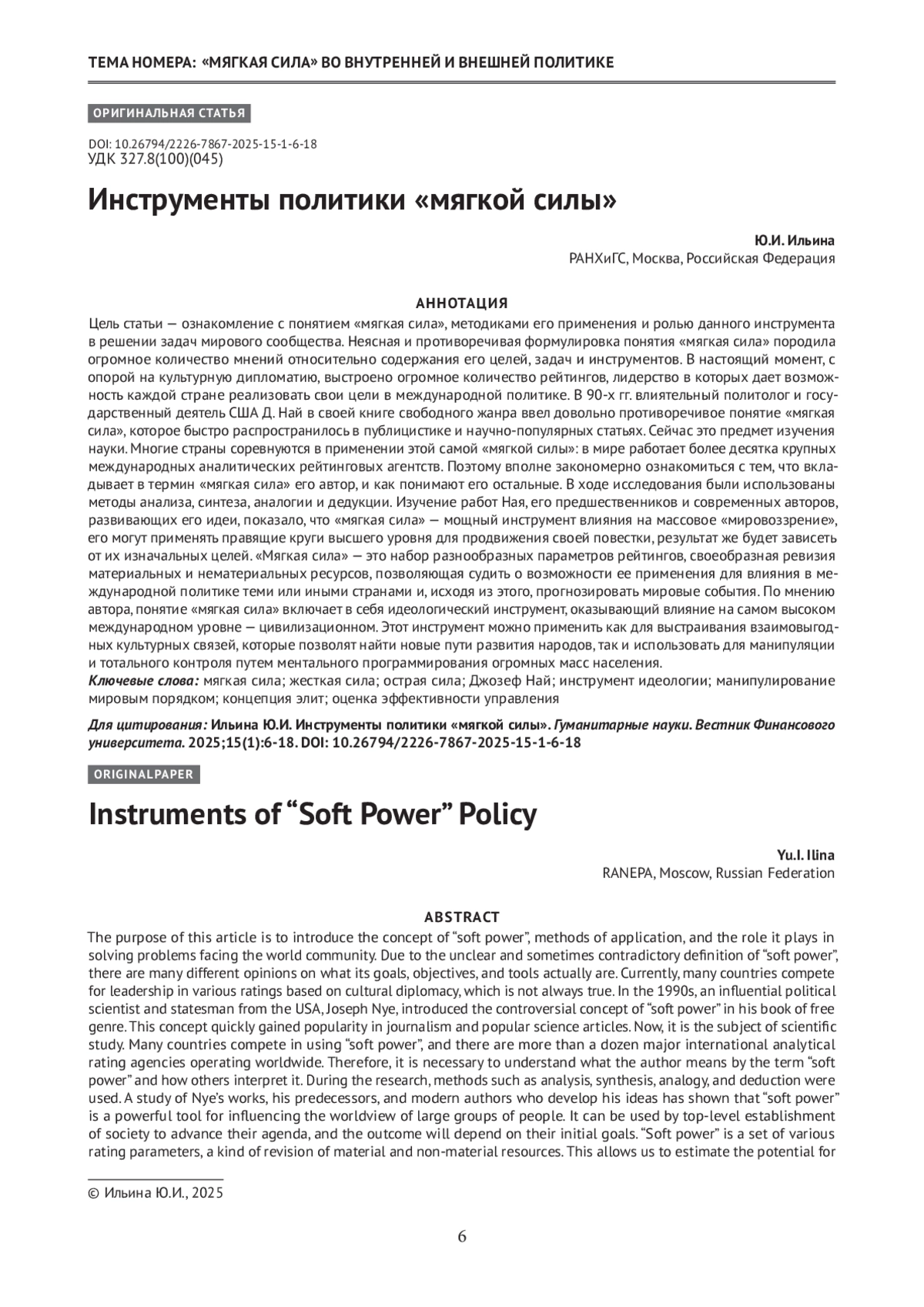 Цель статьи — ознакомление с понятием «мягкая сила», методиками его применения и ролью данного инструмента в решении задач мирового сообщества. Неясная и противоречивая формулировка понятия «мягкая сила» породила огромное количество мнений относительно содержания его целей, задач и инструментов. В настоящий момент, с опорой на культурную дипломатию, выстроено огромное количество рейтингов, лидерство в которых дает возможность каждой стране реализовать свои цели в международной политике. В 90-х гг. влиятельный политолог и государственный деятель США Д. Най в своей книге свободного жанра ввел довольно противоречивое понятие «мягкая сила», которое быстро распространилось в публицистике и научно-популярных статьях. Сейчас это предмет изучения науки. Многие страны соревнуются в применении этой самой «мягкой силы»: в мире работает более десятка крупных международных аналитических рейтинговых агентств. Поэтому вполне закономерно ознакомиться с тем, что вкладывает в термин «мягкая сила» его автор, и как понимают его остальные. В ходе исследования были использованы методы анализа, синтеза, аналогии и дедукции. Изучение работ Ная, его предшественников и современных авторов, развивающих его идеи, показало, что «мягкая сила» — мощный инструмент влияния на массовое «мировоззрение», его могут применять правящие круги высшего уровня для продвижения своей повестки, результат же будет зависеть от их изначальных целей. «Мягкая сила» — это набор разнообразных параметров рейтингов, свое образная ревизия материальных и нематериальных ресурсов, позволяющая судить о возможности ее применения для влияния в международной политике теми или иными странами и, исходя из этого, прогнозировать мировые события. По мнению автора, понятие «мягкая сила» включает в себя идеологический инструмент, оказывающий влияние на самом высоком международном уровне — ц ивилизационном. Этот инструмент можно применить как для выстраивания взаимовыгодных культурных связей, которые позволят найти новые пути развития народов, так и использовать для манипуляции и тотального контроля путем ментального программирования огромных масс населения.