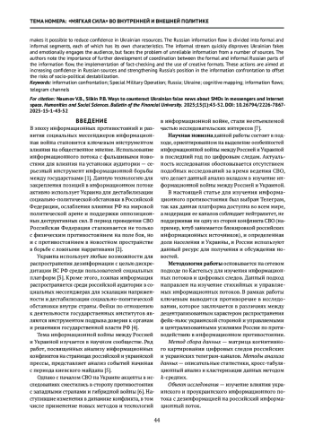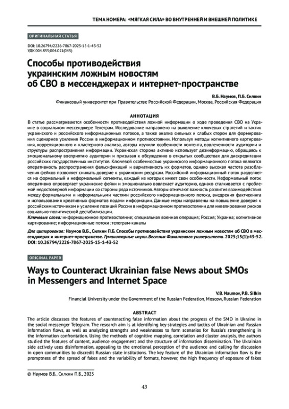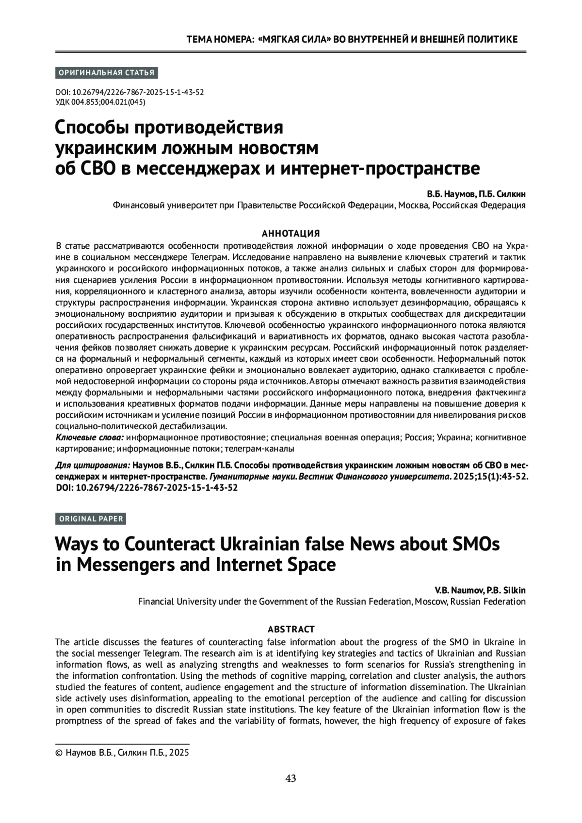 В статье рассматриваются особенности противодействия ложной информации о ходе проведения СВО на Украине в социальном мессенджере Телеграм. Исследование направлено на выявление ключевых стратегий и тактик украинского и российского информационных потоков, а также анализ сильных и слабых сторон для формирования сценариев усиления России в информационном противостоянии. Используя методы когнитивного картирования, корреляционного и кластерного анализа, авторы изучили особенности контента, вовлеченности аудитории и структуры распространения информации. Украинская сторона активно использует дезинформацию, обращаясь к эмоциональному восприятию аудитории и призывая к обсуждению в открытых сообществах для дискредитации российских государственных институтов. Ключевой особенностью украинского информационного потока являются оперативность распространения фальсификаций и вариативность их форматов, однако высокая частота разоблачения фейков позволяет снижать доверие к украинским ресурсам. Российский информационный поток разделяется на формальный и неформальный сегменты, каждый из которых имеет свои особенности. Неформальный поток оперативно опровергает украинские фейки и эмоционально вовлекает аудиторию, однако сталкивается с проблемой недостоверной информации со стороны ряда источников. Авторы отмечают важность развития взаимодействия между формальными и неформальными частями российского информационного потока, внедрения фактчекинга и использования креативных форматов подачи информации. Данные меры направлены на повышение доверия к российским источникам и усиление позиций России в информационном противостоянии для нивелирования рисков социально-политической дестабилизации.