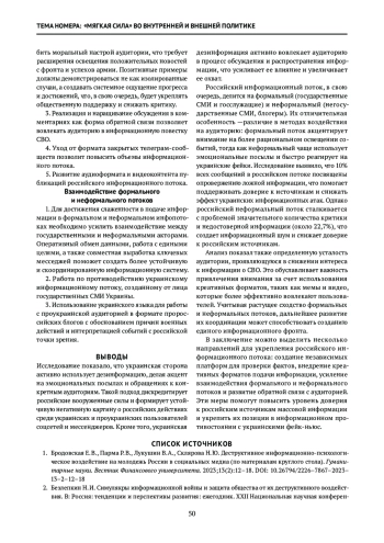 1. Бродовская Е. В., Парма Р. В., Лукушин В. А., Склярова Н. Ю. Деструктивное информационно-психологическое воздействие на молодежь России в социальных медиа (по материалам круглого стола). Гуманитарные науки. Вестник Финансового университета. 2023;13(2):12-18. https://doi.org/10.26794/2226-7867-2023- 13-2-12-18
