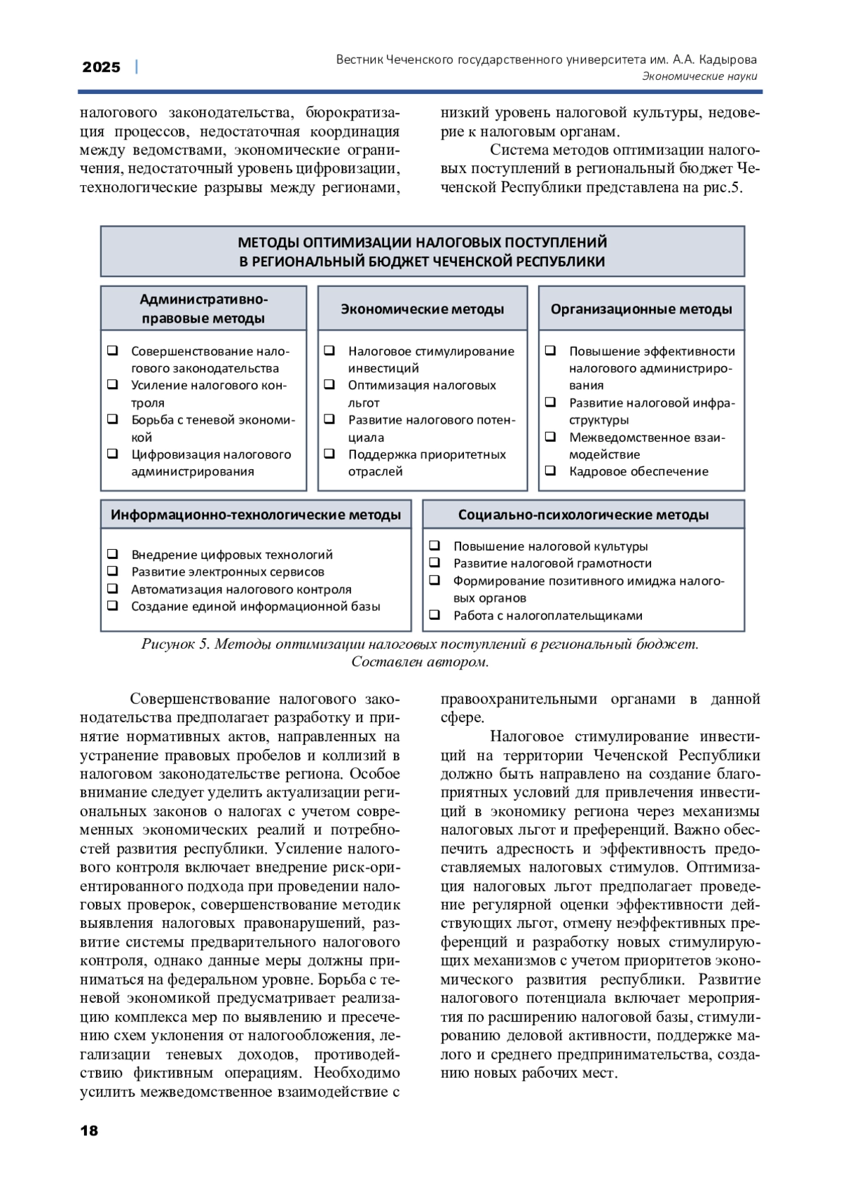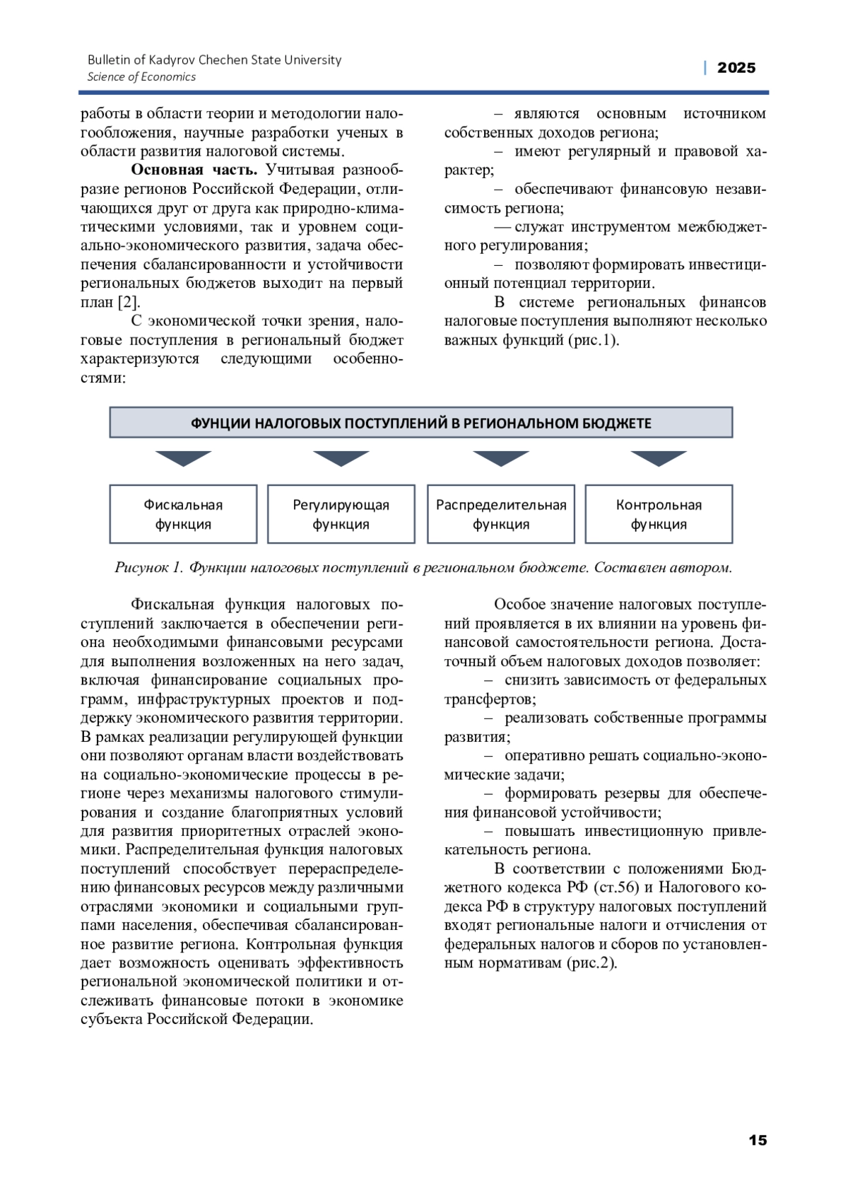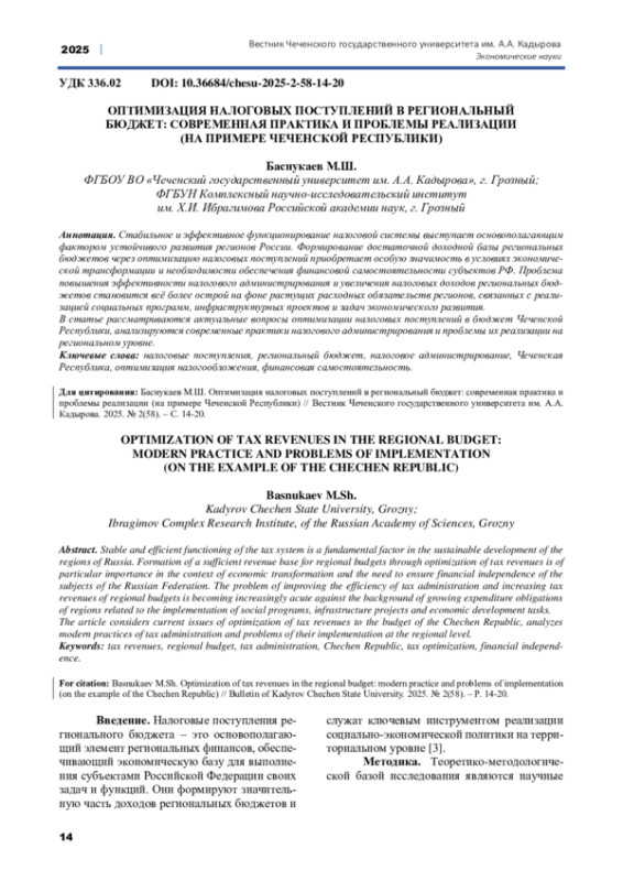 Стабильное и эффективное функционирование налоговой системы выступает основополагающим фактором устойчивого развития регионов России. Формирование достаточной доходной базы региональных бюджетов через оптимизацию налоговых поступлений приобретает особую значимость в условиях экономической трансформации и необходимости обеспечения финансовой самостоятельности субъектов РФ. Проблема повышения эффективности налогового администрирования и увеличения налоговых доходов региональных бюджетов становится всё более острой на фоне растущих расходных обязательств регионов, связанных с реализацией социальных программ, инфраструктурных проектов и задач экономического развития. В статье рассматриваются актуальные вопросы оптимизации налоговых поступлений в бюджет Чеченской Республики, анализируются современные практики налогового администрирования и проблемы их реализации на региональном уровне.