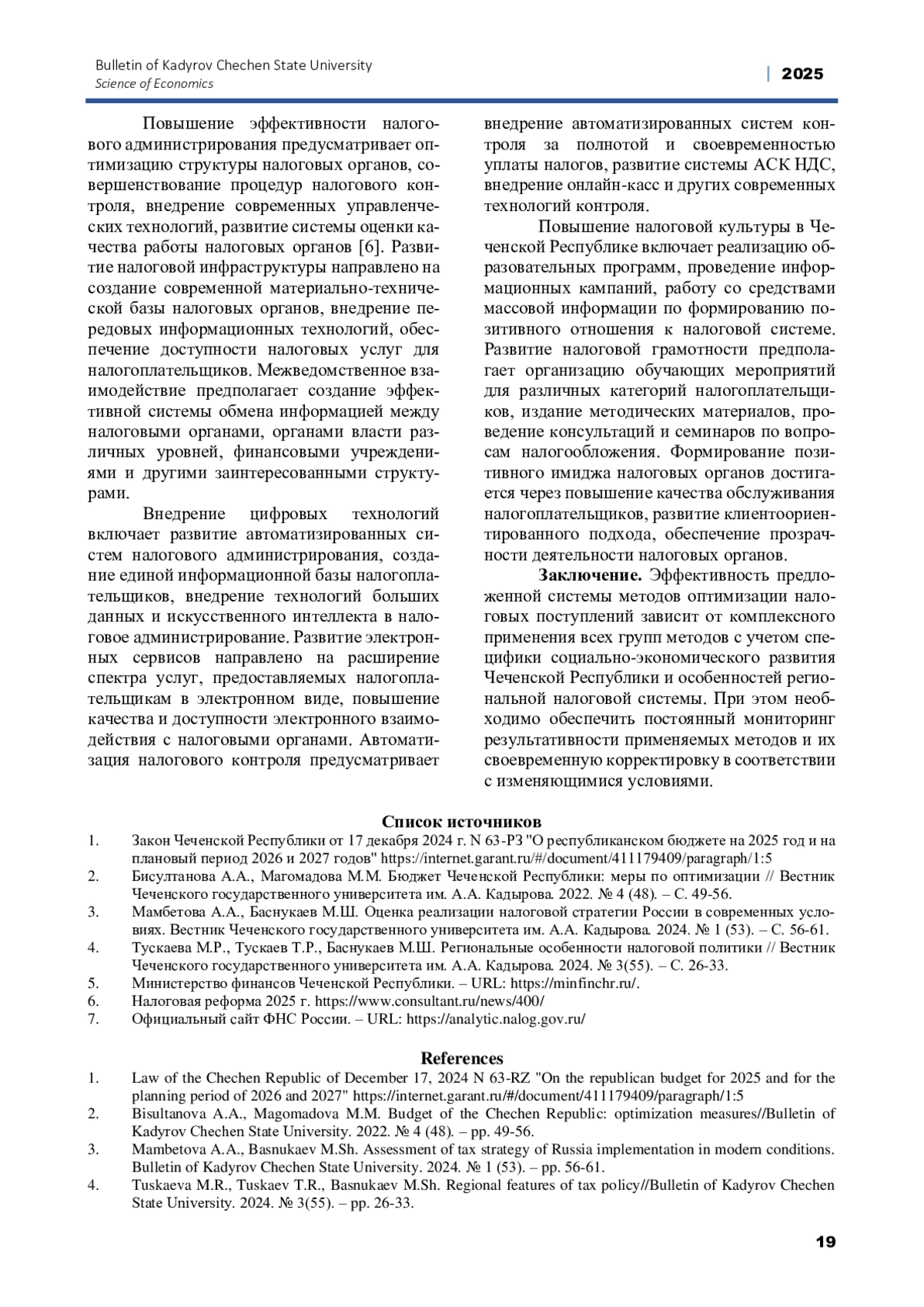 3. Мамбетова А.А., Баснукаев М.Ш. Оценка реализации налоговой стратегии России в современных условиях. Вестник Чеченского государственного университета им. А.А. Кадырова. 2024. № 1 (53). - С. 56-61. EDN: CVFNWC