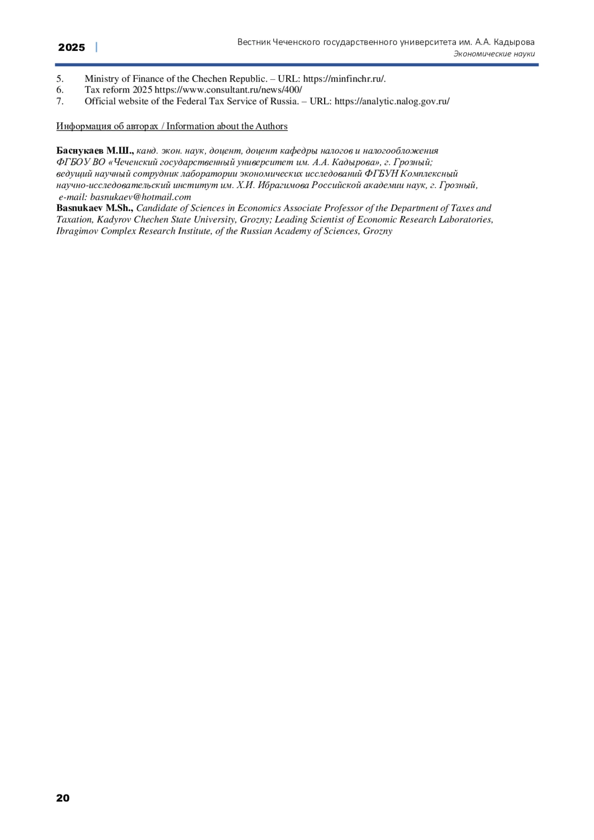4. Тускаева М.Р., Тускаев Т.Р., Баснукаев М.Ш. Региональные особенности налоговой политики // Вестник Чеченского государственного университета им. А.А. Кадырова. 2024. № 3(55). - С. 26-33. EDN: DCPJTU