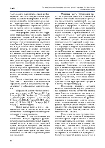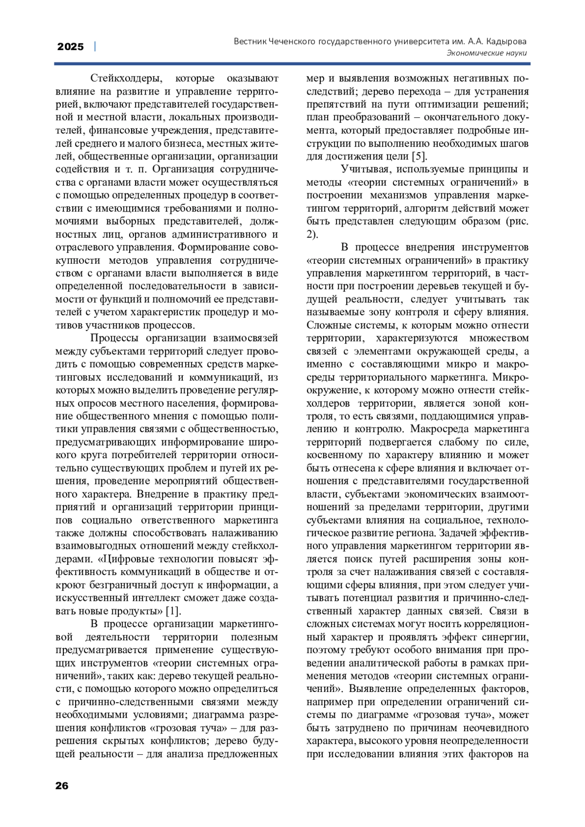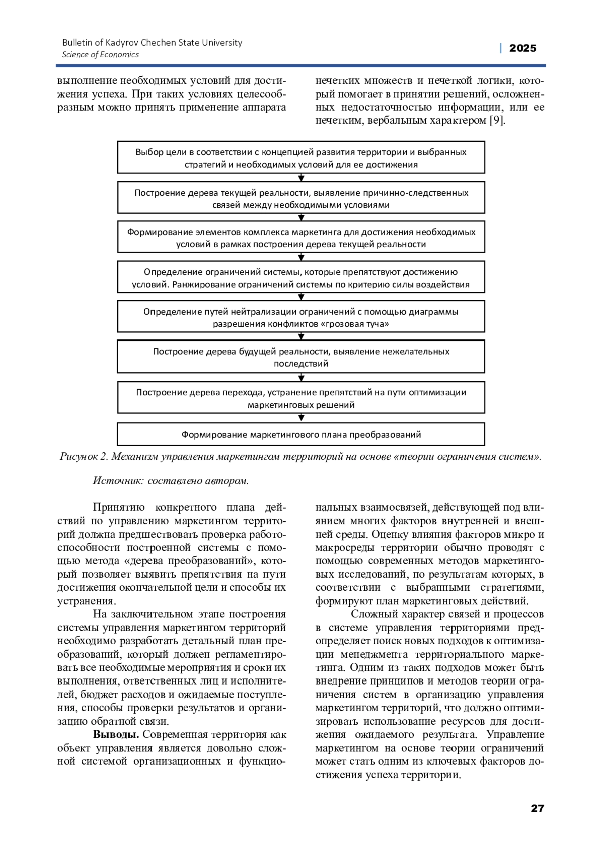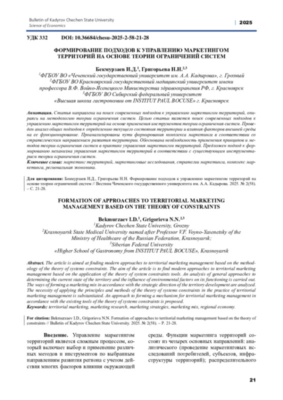 Статья направлена на поиск современных подходов к управлению маркетингом территорий, опираясь на методологию теории ограничения систем. Целью статьи является поиск современных подходов к управлению маркетингом территорий на основе применения инструментов теории ограничения систем. Проведен анализ общих подходов к определению текущего состояния территории и влияния факторов внешней среды на ее функционирование. Проанализированы пути формирования комплекса маркетинга в соответствии со стратегическим направлением развития территории. Обоснована необходимость применения принципов и методов теории ограничения систем в практике управления маркетингом территорий. Предложен подход к формированию механизма управления маркетингом территорий в соответствии с существующим инструментарием теории ограничения систем.