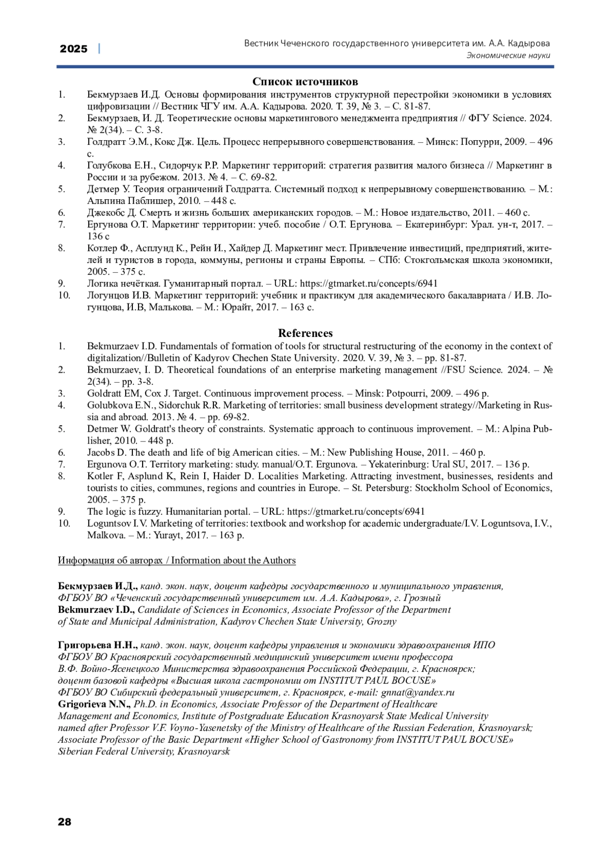 1. Бекмурзаев И.Д. Основы формирования инструментов структурной перестройки экономики в условиях цифровизации // Вестник ЧГУ им. А.А. Кадырова. 2020. Т. 39, № 3. - С. 81-87.