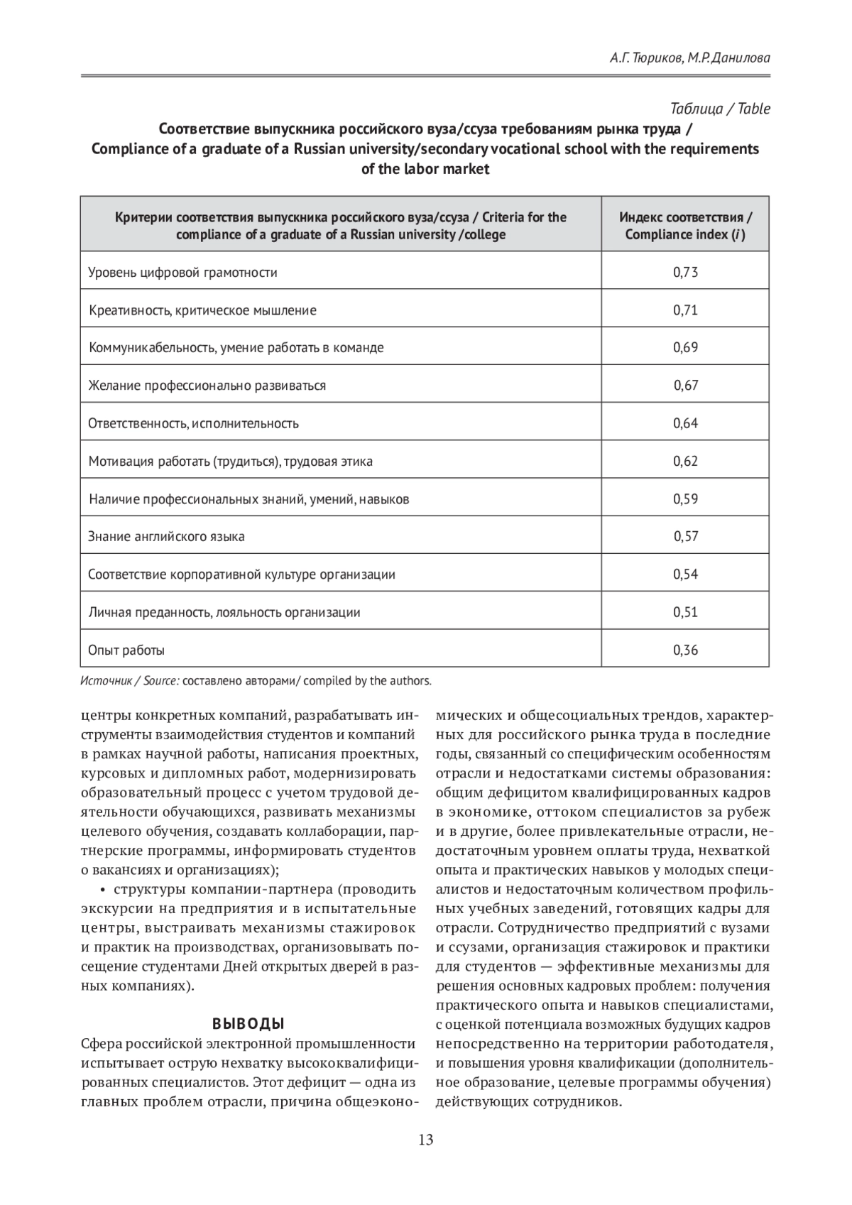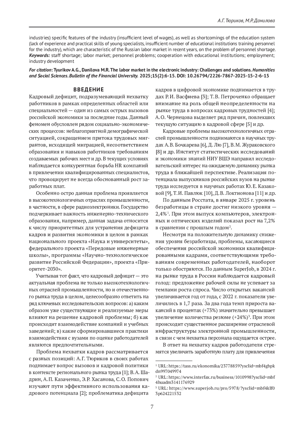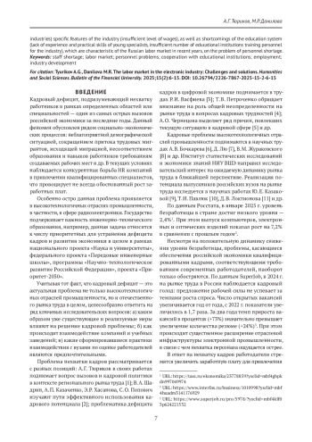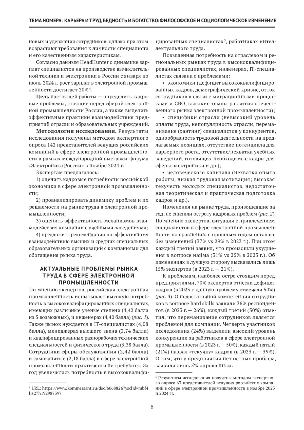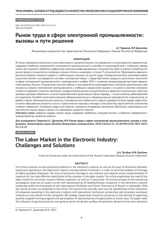 В статье приводятся результаты мониторингового социологического исследования и анализируются современные кадровые проблемы предприятий электронной промышленности, способы их взаимодействия с учебными заведениями для решения проблемы дефицитов высококвалифицированных специалистов. Дается оценка потребностей рынка труда в специалистах, имеющих ученые степени, инженерах, а также IT-специалистах. Предложены варианты решения вопроса нехватки кадров и стабилизации ситуации на рынке труда. Эмпирическую базу мониторингового социологического исследования составил экспертный опрос с представителями ведущих российских компаний в сфере электронной промышленности, проведенный в ноябре 2024 г. в рамках международной выставки-форума «Электроника России». Результатом научной работы стало выделение взаимодействия компаний, реализующих деятельность в отрасли электронной промышленности, с учебными заведениями (вузами и ссузами) в качестве ключевого элемента кадровой стратегии компаний. сотрудничество должно осуществляться в форматах организации практики, целевых программ обучения и участия представителей организаций в Днях карьеры — очных встречах работодателей со студентами. В работе отмечаются влияние общеэкономических и общесоциальных трендов (отток специалистов за рубеж и более привлекательные отрасли), специфические особенности отрасли (уровень оплаты труда), недостатки системы образования (нехватка опыта и практических навыков у молодых специалистов, недостаточное количество учебных заведений, готовящих кадры для отрасли, морально устаревшая программа обучения), характерные для российского рынка труда в целом, что сдерживает развитие отрасли.