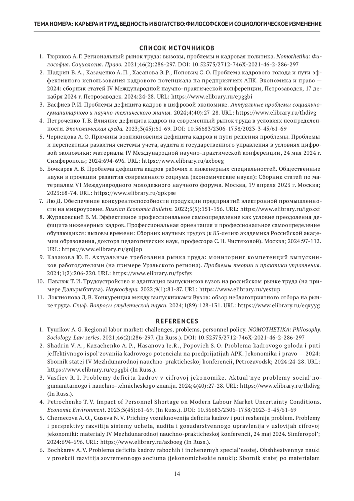 4. Петроченко Т. В. Влияние дефицита кадров на современный рынок труда в условиях неопределенности. Экономическая среда. 2023;3(45):61-69. https://doi.org/10.36683/2306-1758/2023-3-45/61-69