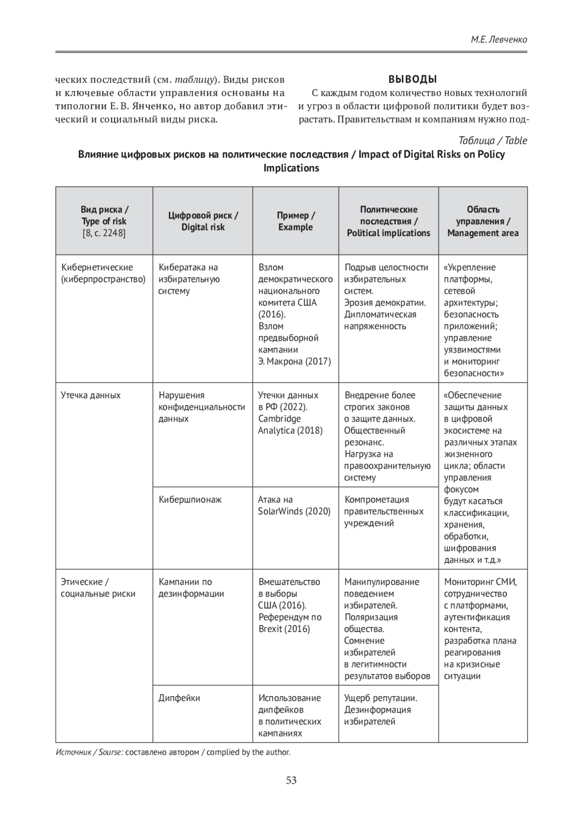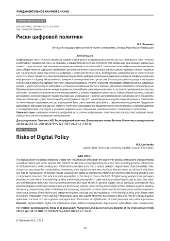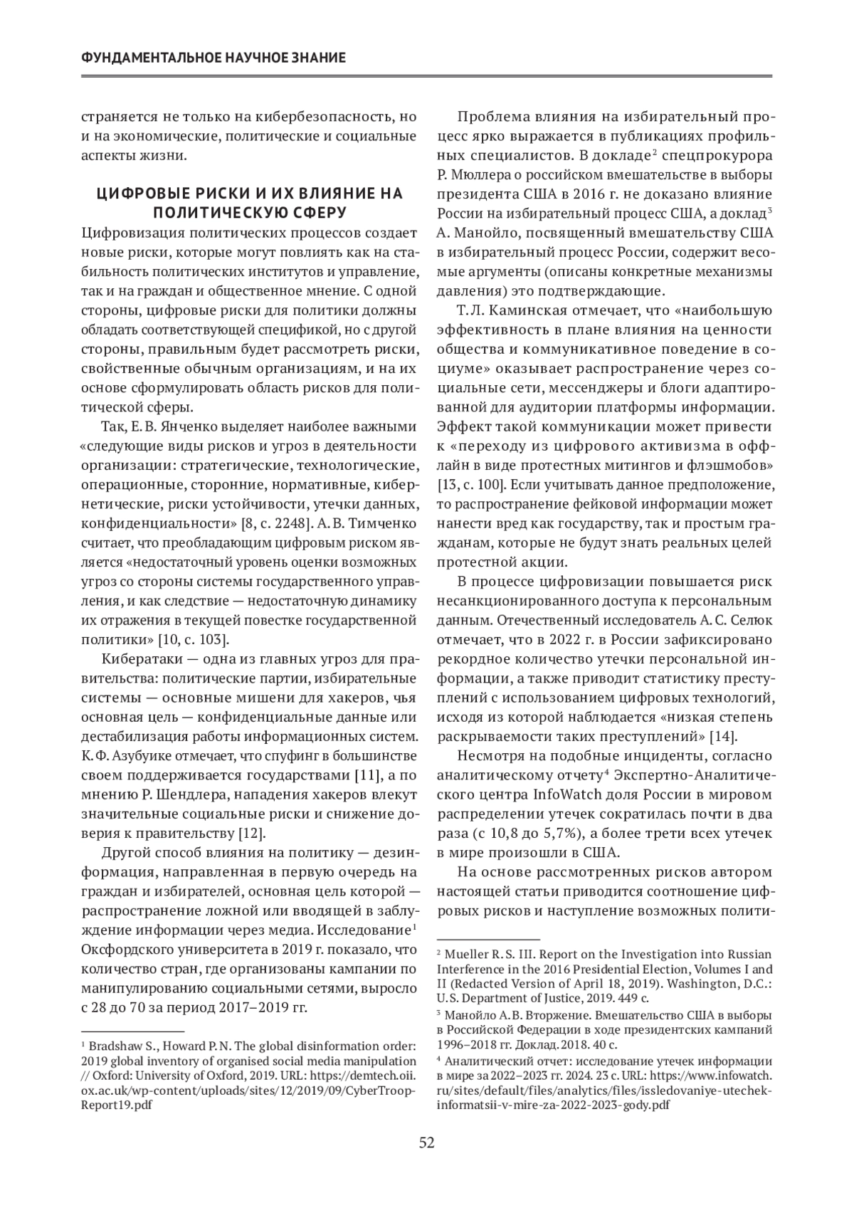 Цифровизация политических процессов создает новые риски, оказывающие влияние как на стабильность политических институтов и управление, так и на граждан, и общественное мнение. Интернет стал огромным хранилищем различных данных, среди которых персональные сведения миллионов пользователей. К сожалению, такая информационная насыщенность оборачивается серьезной проблемой: регулярные утечки персональных данных делают граждан легкой мишенью для манипуляций, ставя под угрозу их цифровую и реальную безопасность. Киберугрозы, направленные на политические институты, могут привести к манипулированию результатами выборов, несанкционированному доступу к конфиденциальной информации и подрыву общественного доверия к демократическим процессам. В статье раскрыты подходы к исследованию рисков в области цифровой политики, проанализированы типологии рисков, произведен обзор основных цифровых рисков и угроз (доминируют кибератаки, несанкционированный доступ к данным), фейковых новостей и дезинформации. Сформулирована взаимосвязь между видами рисков в общем, цифровыми рисками в частности, примерами рисков, возможными негативными политическими последствиями, а именно подрывом целостности избирательной системы, эрозией демократии, компрометацией правительственных учреждений и ростом дипломатической напряженности. Правительствам и компаниям нужно поддерживать непрерывный процесс мониторинга и внедрять новые практики и технологии по минимизации цифровых рисков, а гражданам быть ответственнее при работе с персональными данными. Предметом дальнейших обсуждений в данной области может стать исследование общественного мнения граждан в вопросе доверия к государственным структурам в условиях цифровизации социальных, экономических и политических процессов.